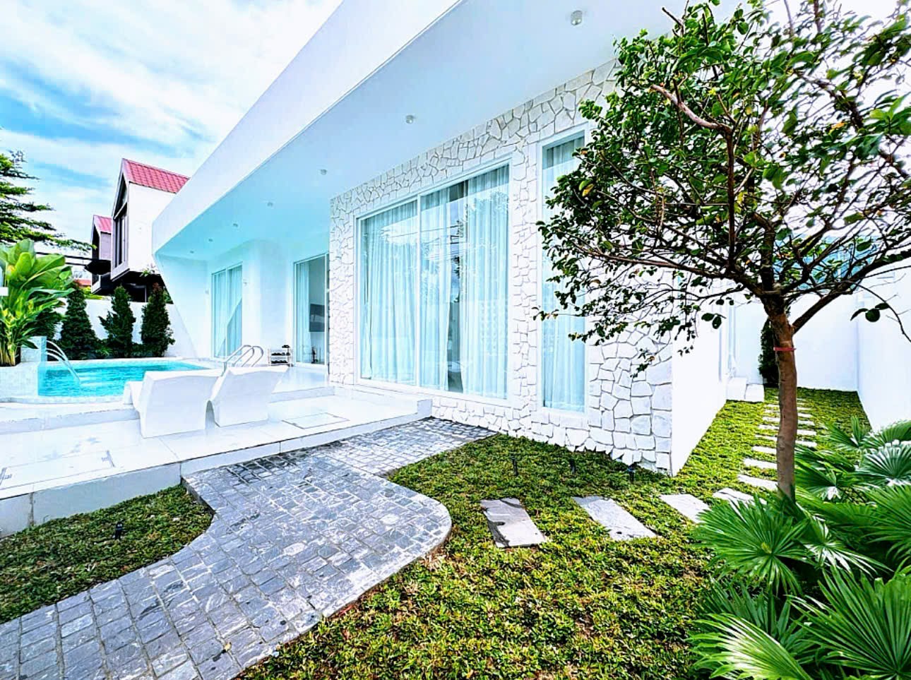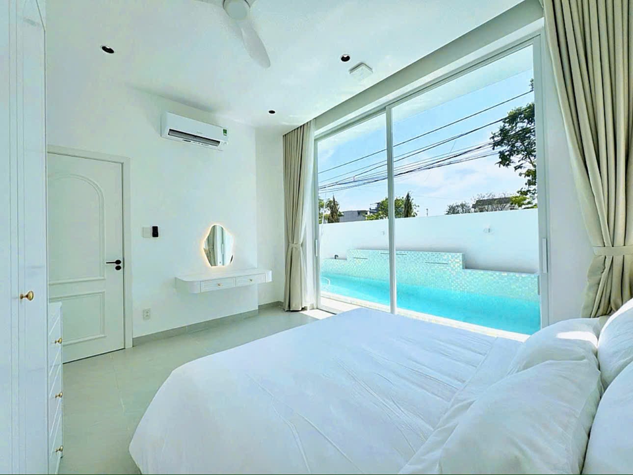 Ấn tượng đầu tiên tại B1 Villa là sự sáng sủa và liền mạch. Kiến trúc hiện đại với tông trắng làm chủ đạo giúp không gian luôn thoáng đãng, sạch sẽ và dễ chịu. Các mảng kính lớn mở ra khoảng xanh và hồ bơi, cho phép ánh sáng tự nhiên len sâu vào từng góc nhà.