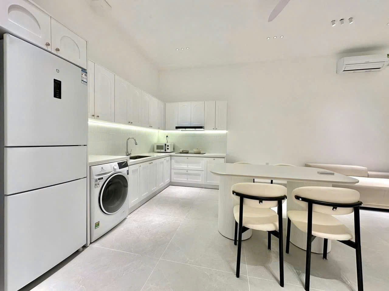 Bên trong B3 Villa, khu sinh hoạt chung được tổ chức theo dạng mở, kết nối trực tiếp giữa phòng khách và bếp. Ghế sofa gọn gàng, bàn ăn bố trí hợp lý giúp việc sinh hoạt chung diễn ra thuận tiện, không bị chồng chéo. Đây là không gian phù hợp cho những buổi trò chuyện nhẹ, bữa ăn đơn giản hoặc thời gian nghỉ ngơi sau khi di chuyển.