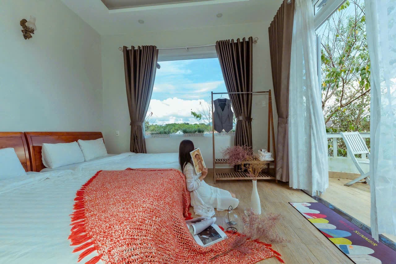 Ba phòng đôi tại tầng một, mỗi phòng đều có nhà vệ sinh riêng và ban công kèm bàn cafe ngắm cảnh.