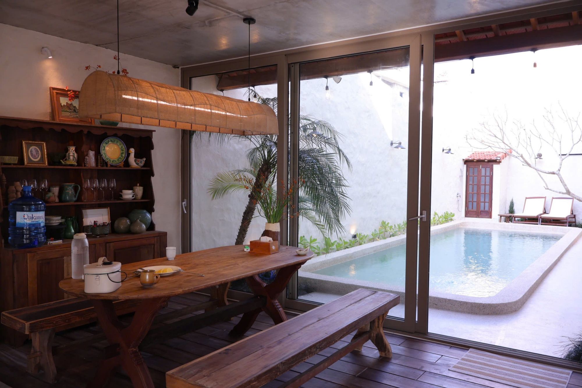 Tâm điểm của sự thư giãn chính là khu vực hồ bơi ngoài trời rộng 24m² ($8 \times 3m$). Giữa cái nắng vàng óng ả của Hội An, còn gì tuyệt vời hơn khi được thả mình trong làn nước mát lạnh, tận hưởng không gian thoáng đãng và nhâm nhi một ly nước mát. Đây chính là toạ độ lý tưởng để bạn "sạc" lại năng lượng, đọc một cuốn sách hay đơn giản là ngắm nhìn bầu trời xanh trong vắt từ dưới mặt nước.