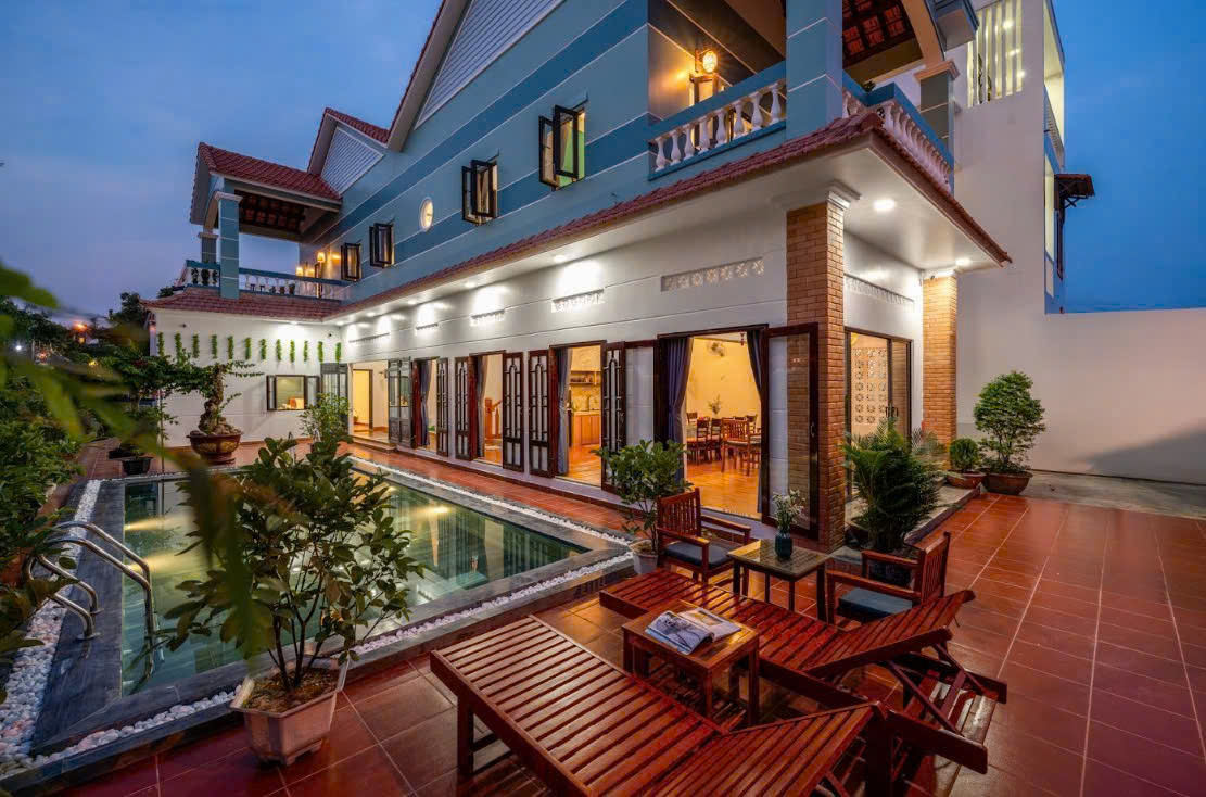 Villa được thiết kế rộng rãi với phòng khách, bếp đầy đủ tiện nghi và hồ bơi riêng. Không gian lưu trú gồm 4 phòng ngủ, trong đó có 3 phòng đôi sức chứa 4 khách mỗi phòng và 1 phòng gia đình dành cho 8 người với thiết kế 2 phòng thông nhau, tổng sức chứa tiêu chuẩn lên đến 20 khách. Ngoài ra, villa còn có khu vực nướng BBQ ngoài vườn, loa miễn phí sử dụng đến 21h và cửa hàng tạp hóa ngay sát bên, vô cùng tiện lợi cho sinh hoạt và vui chơi.