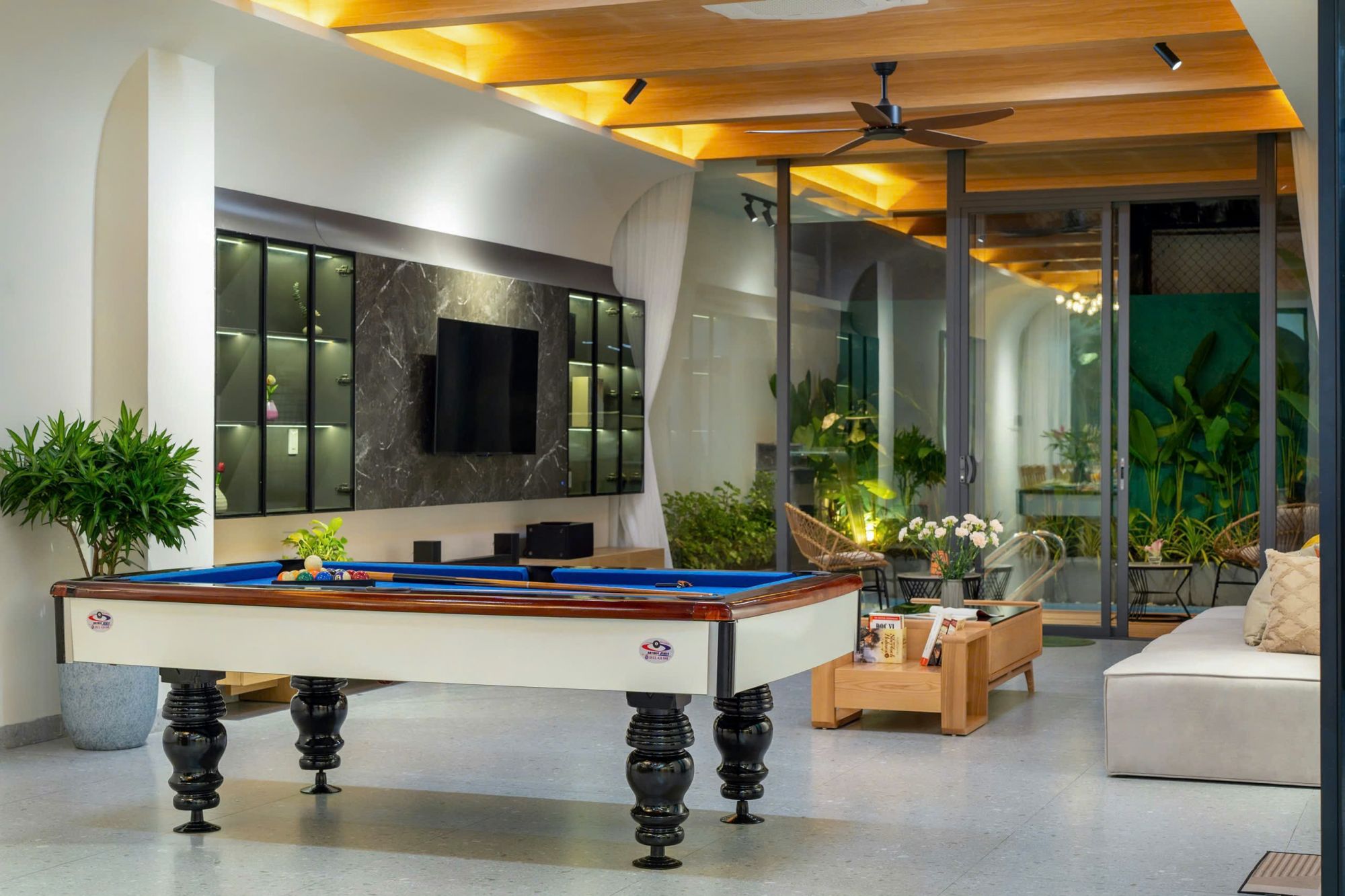 Điểm nổi bật của villa nằm ở phòng khách rộng rãi, nơi ánh sáng len qua các mảng cửa lớn, phản chiếu trên gam màu nội thất hiện đại. TV 55 inch tạo không gian giải trí lý tưởng cho những buổi quây quần, trong khi bàn bi-a và khu nướng BBQ giúp cả nhóm kết nối trong những khoảnh khắc đầy năng lượng. Đây là không gian mang cảm giác gắn kết rất tự nhiên, phù hợp cho các gia đình lớn hoặc nhóm bạn tìm nơi tụ họp thoải mái.