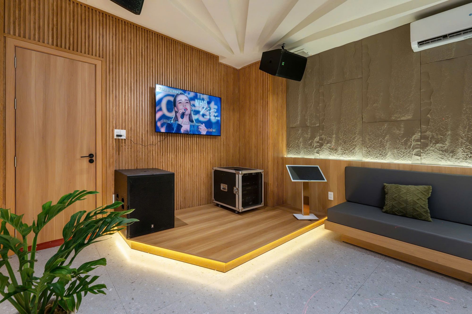 Bên cạnh khu sinh hoạt chung, villa còn sở hữu một phòng karaoke riêng với hệ thống âm thanh sống động, mang lại không khí sôi nổi cho những buổi tối tụ họp (sử dụng đến 22:00, phụ thu 500.000 VND). Hồ bơi tại tầng 1 mở ra một không gian thư giãn mát mẻ, nơi mọi người có thể tận hưởng thời gian thảnh thơi giữa những ngày nắng đẹp của Đà Nẵng. Từng khu vực đều được bài trí theo hướng thực tế và gần gũi, tránh cảm giác cầu kỳ nhưng vẫn đảm bảo sự tiện nghi.