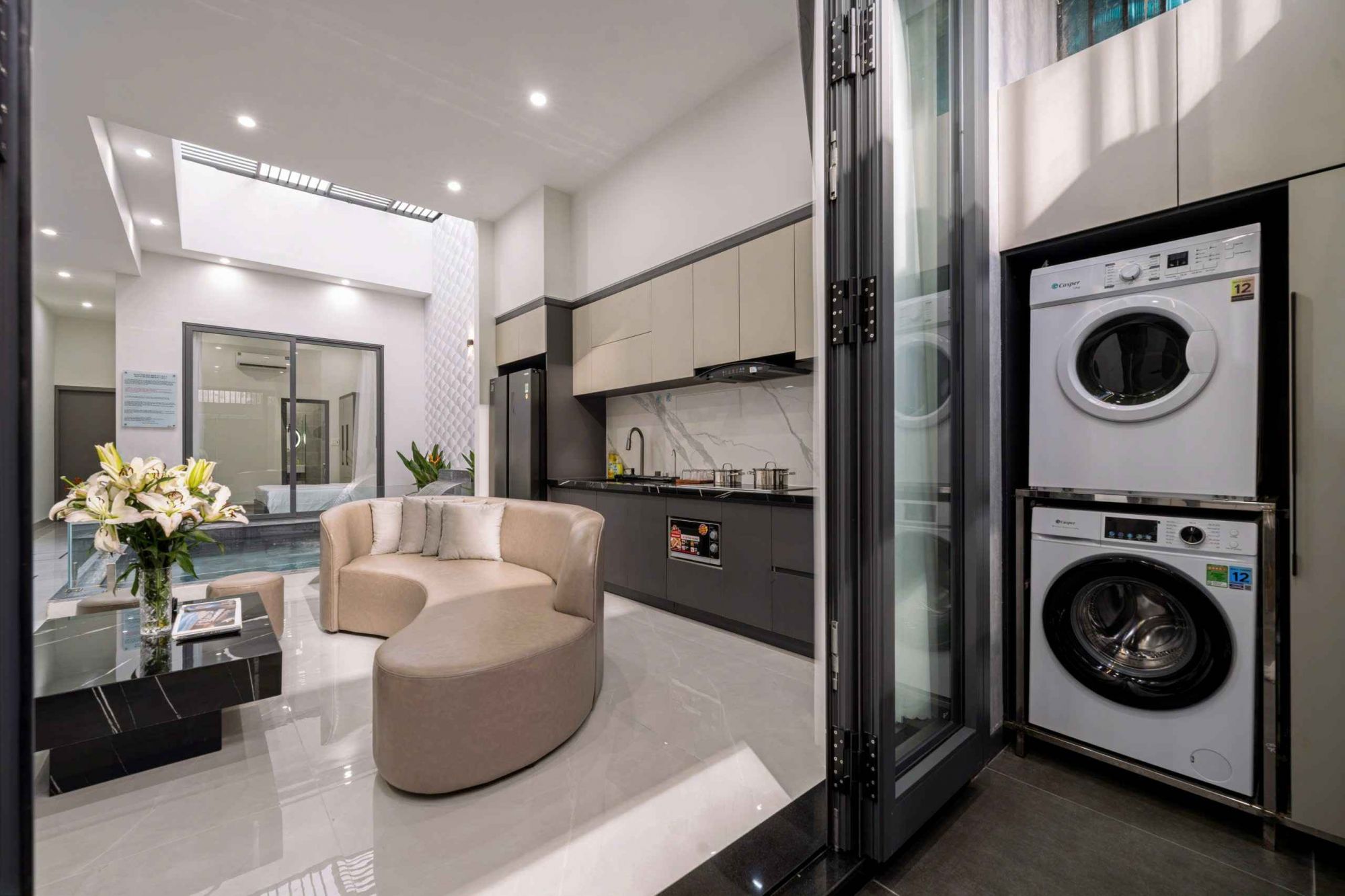 Villa gồm 2 phòng ngủ rộng rãi, phù hợp cho 4 người lớn và 2 trẻ em. Nội thất được bày trí tối giản nhưng tinh tế, tạo cảm giác ấm áp như ở nhà. Không gian sinh hoạt chung kết hợp với bếp tiện nghi, cho phép nấu nướng và quây quần bên gia đình hay bạn bè.