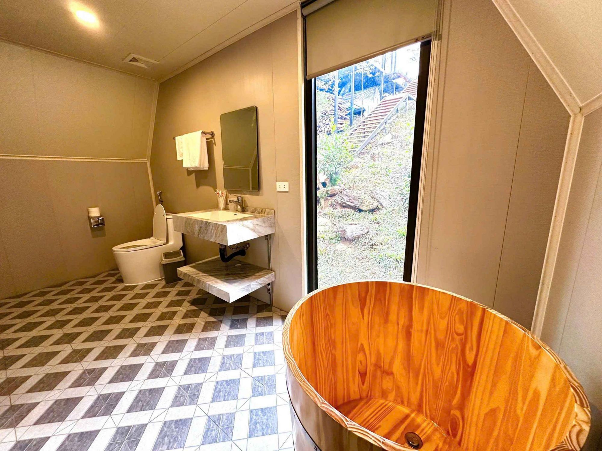 Mỗi bungalow rộng 40m² với thiết kế mở, từ giường ngủ có thể ngắm trực diện núi Ba Vì. Ban công rộng rãi tạo nên một góc chill hoàn hảo để nhâm nhi tách trà, đón bình minh hoặc ngắm hoàng hôn. Phòng tắm riêng được trang bị bồn ngâm thảo dược – mang lại sự thư giãn tuyệt đối sau một ngày khám phá.