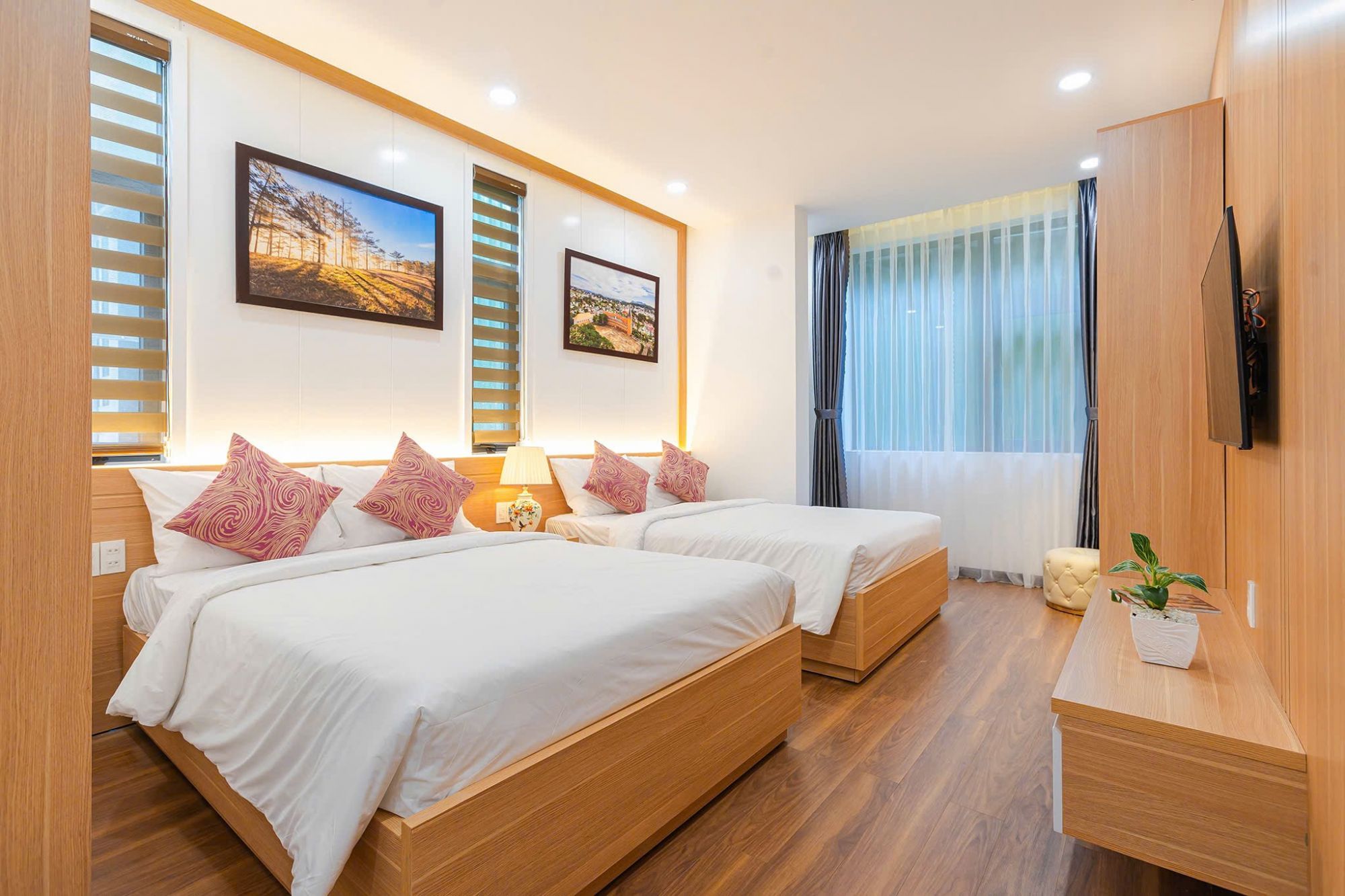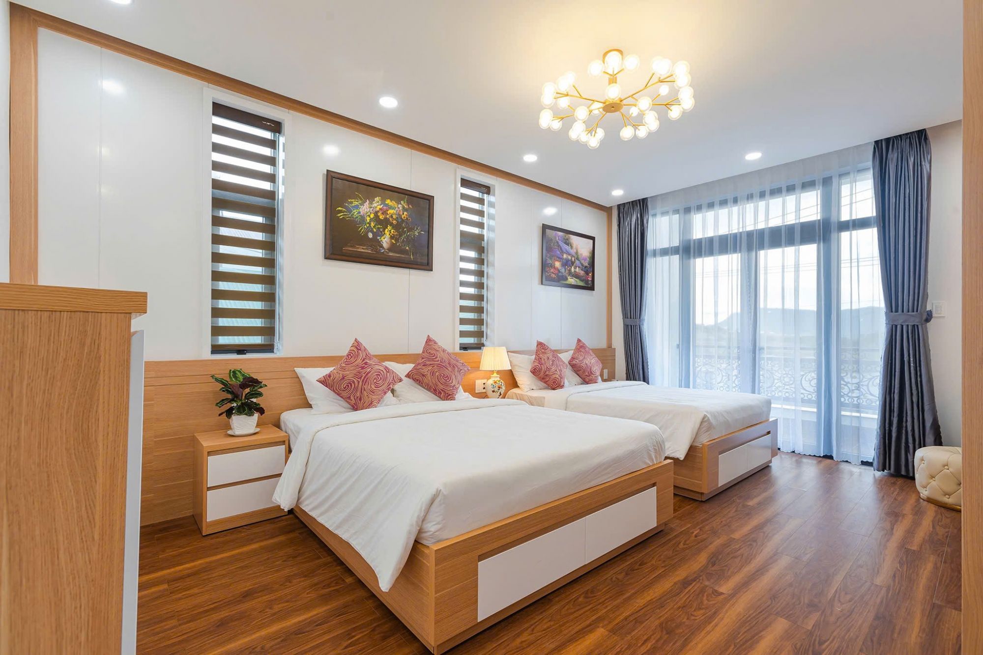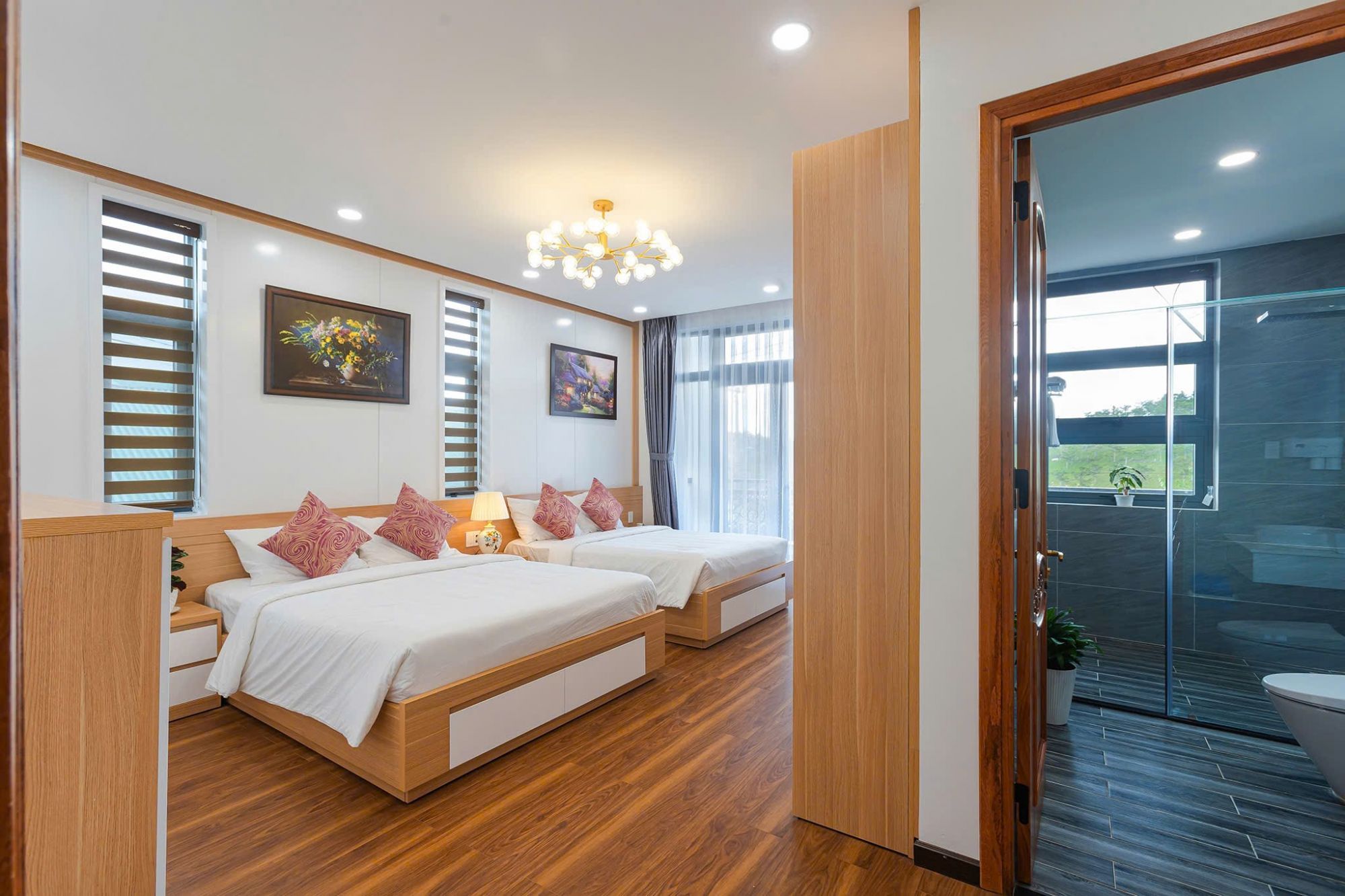 Hệ thống phòng ngủ tại Cara Villa được thiết kế theo hướng tối giản và thực tế. Giường ngủ đặt ở vị trí trung tâm, ánh sáng tự nhiên dịu qua cửa sổ và rèm giúp không gian luôn dễ chịu. Màu sắc trung tính kết hợp nội thất gỗ mang lại cảm giác ấm áp, phù hợp cho việc nghỉ ngơi sau một ngày di chuyển.