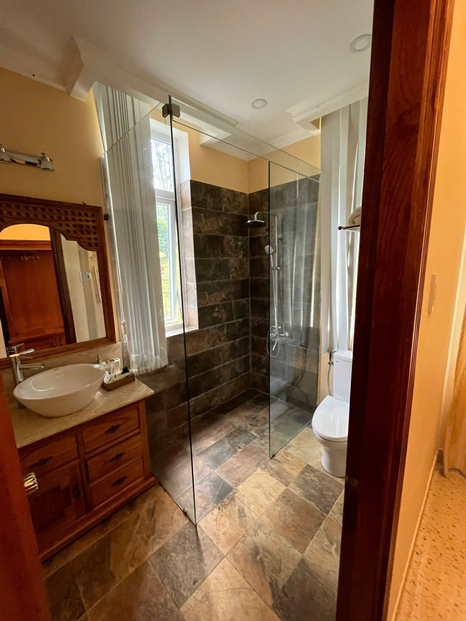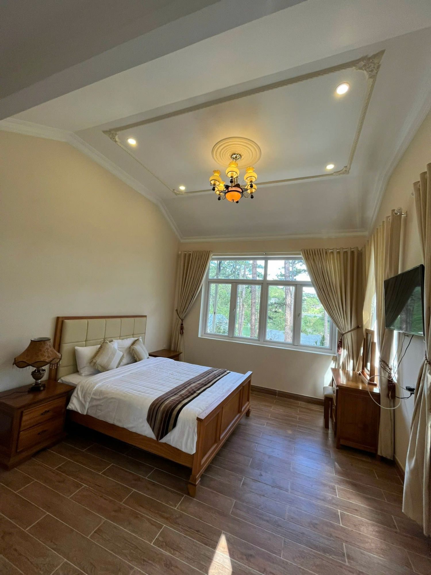 Không gian bên trong được bố trí hợp lý với 4 phòng ngủ gồm 1 phòng Standard, 2 phòng Deluxe có bồn tắm và 1 phòng Superior. Mỗi phòng đều có nhà vệ sinh riêng, đảm bảo sự riêng tư và thoải mái cho từng khách. Villa phù hợp cho nhóm khoảng 8 người lưu trú.