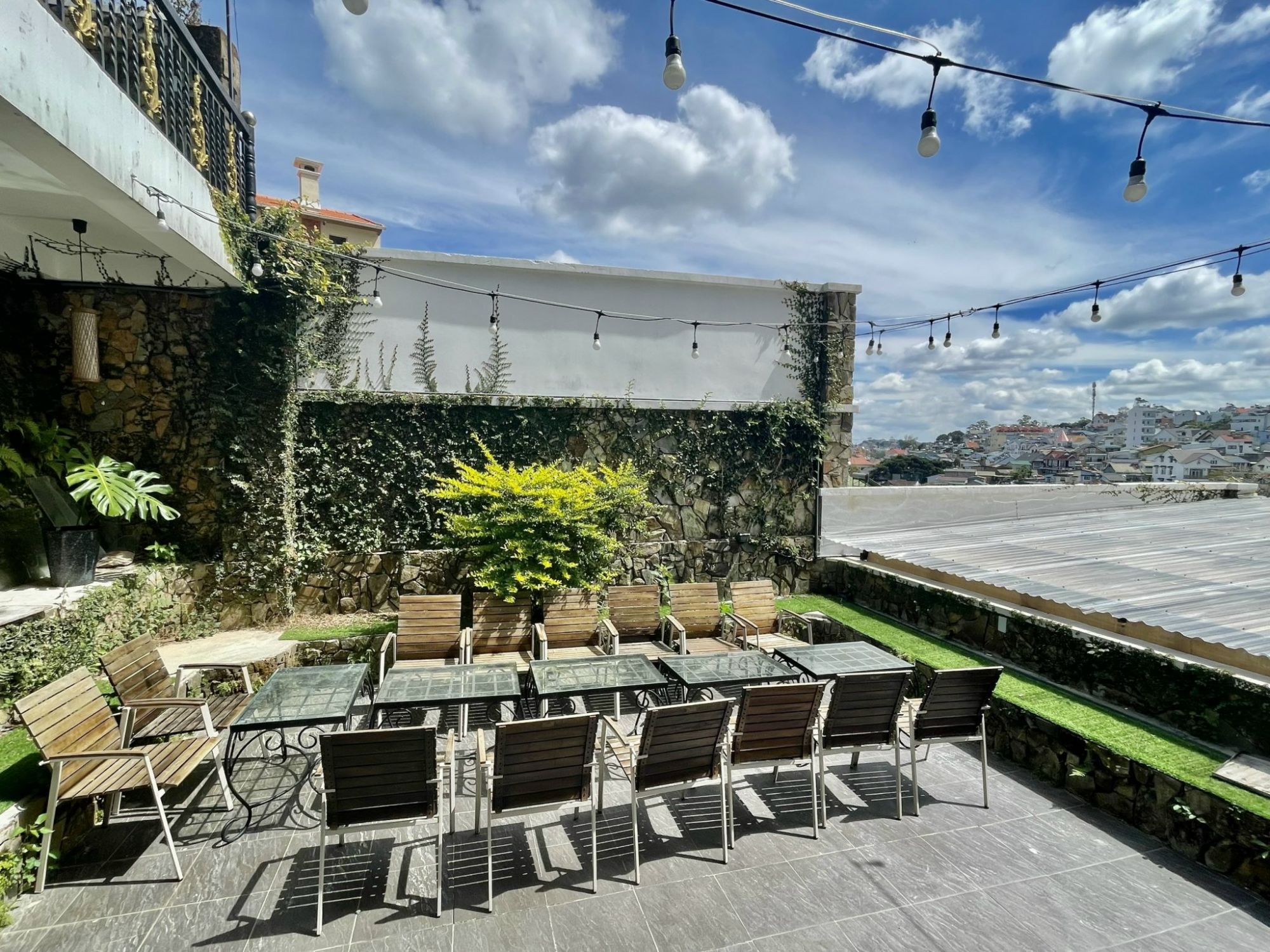 Không gian ngoài trời được bố trí mở, cho phép ánh sáng và gió tự nhiên lưu chuyển, tạo nên bầu không khí thoáng đãng suốt cả ngày.