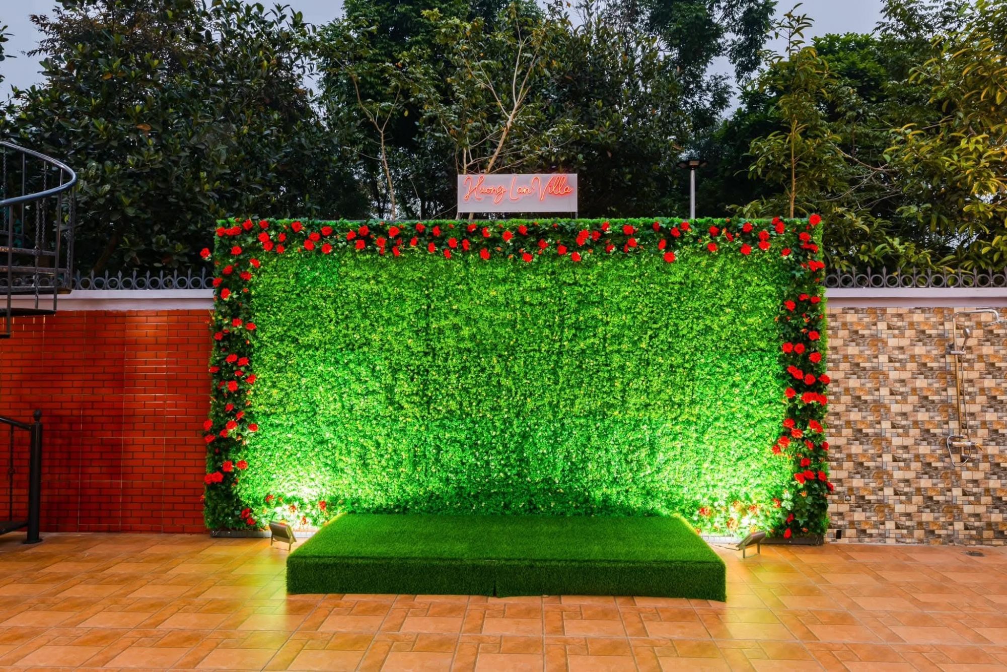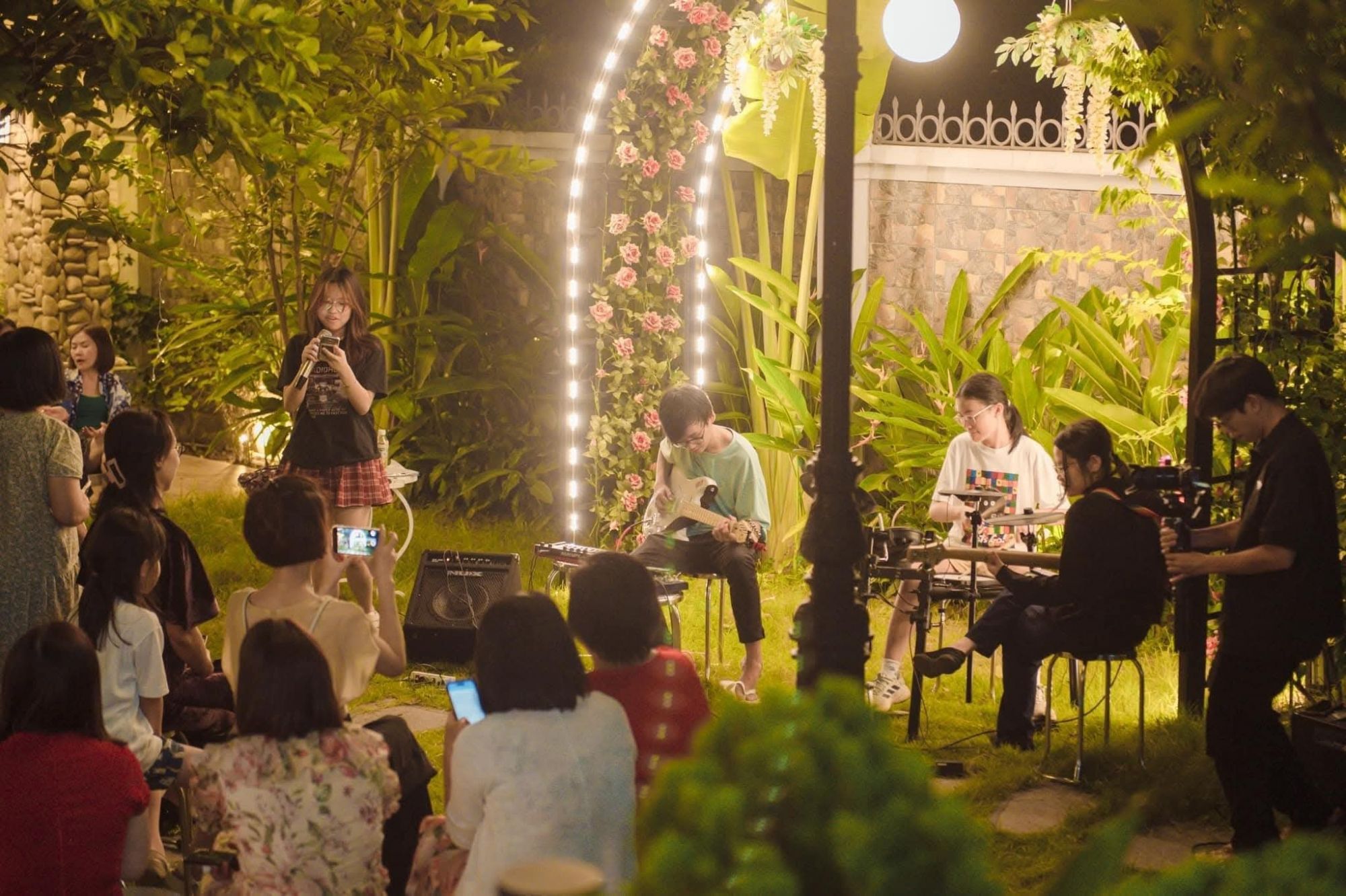 Sân khấu ngoài trời + hệ thống âm thanh, đèn sân khấu, bàn ăn dài 30–40 người