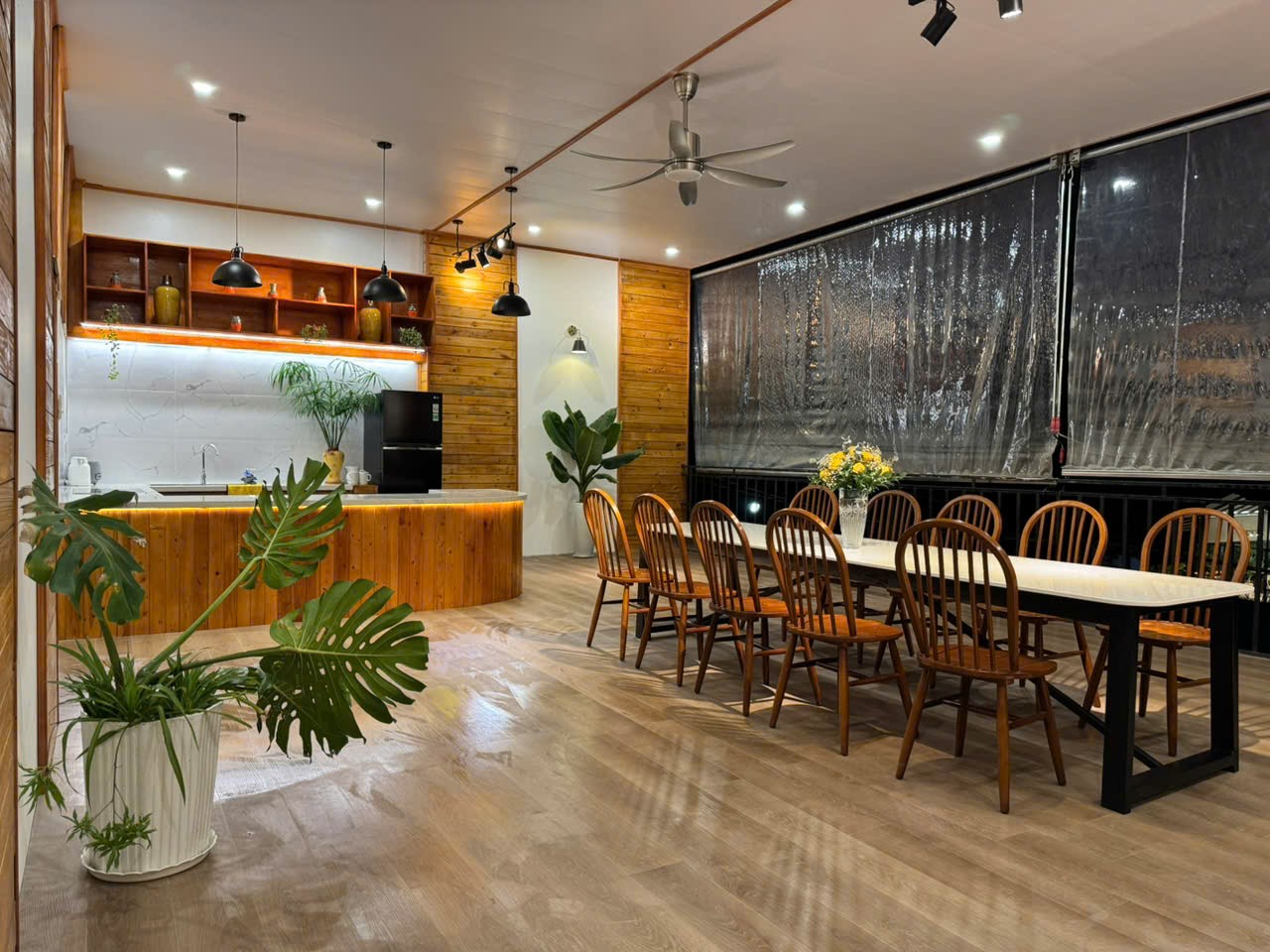 Khu bếp tại G3PN Villa được trang bị đầy đủ dụng cụ nấu nướng cùng các loại gia vị cơ bản, cho phép các nhóm chủ động chuẩn bị bữa ăn theo sở thích. Không gian bếp gắn liền với khu sinh hoạt chung, tạo cảm giác ấm cúng và dễ kết nối. Đây là nơi lý tưởng để cùng nhau nấu ăn, trò chuyện và tận hưởng những khoảnh khắc quây quần trong chuyến đi.