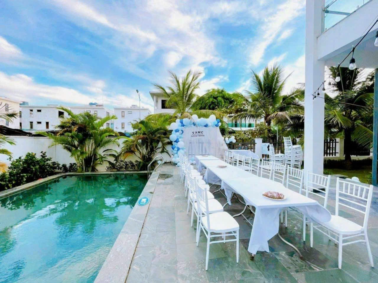 Ngoài ra, khu vực sân vườn rộng rãi, xanh mát cũng được trang bị bàn ghế ăn ngoài trời, rất thích hợp cho các bữa tiệc BBQ dưới ánh đèn lung linh buổi tối. Dụng cụ nướng BBQ được chuẩn bị sẵn, giúp bạn dễ dàng tổ chức một bữa tiệc ngon lành và đáng nhớ.