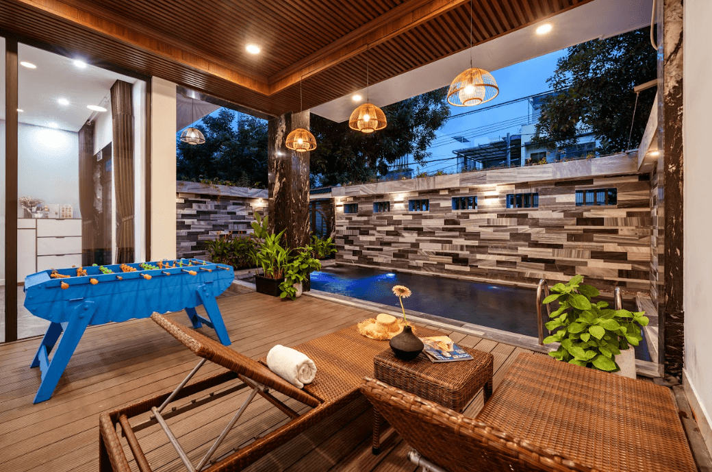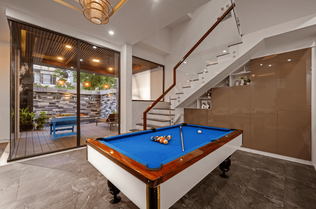 Không gian sinh hoạt chung tại Hana Villa rộng rãi, thoáng đãng, rất phù hợp cho những buổi quây quần, nghỉ dưỡng và thư giãn cùng gia đình hoặc bạn bè. Villa được trang bị đầy đủ các khu vực giải trí như bàn bida, bi lắc, giúp mọi người có thêm nhiều lựa chọn vui chơi ngay tại nơi lưu trú. Bên cạnh đó, hồ bơi ngoài trời được bố trí hài hòa trong khuôn viên, là điểm nhấn lý tưởng để thư giãn, tận hưởng làn nước mát và tổ chức những buổi nghỉ ngơi nhẹ nhàng sau ngày dài khám phá thành phố.
