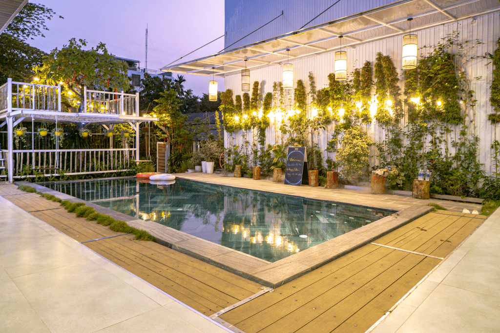 Bếp hiện đại kết hợp khu BBQ ngoài trời và quầy bar giúp dễ dàng tổ chức tiệc. Ngoài ra còn có lưới võng thư giãn và khu ngắm sao, tạo thêm trải nghiệm thú vị vào buổi tối. Không gian phù hợp cho gia đình, nhóm bạn hoặc các buổi tiệc riêng tư tại Huế.