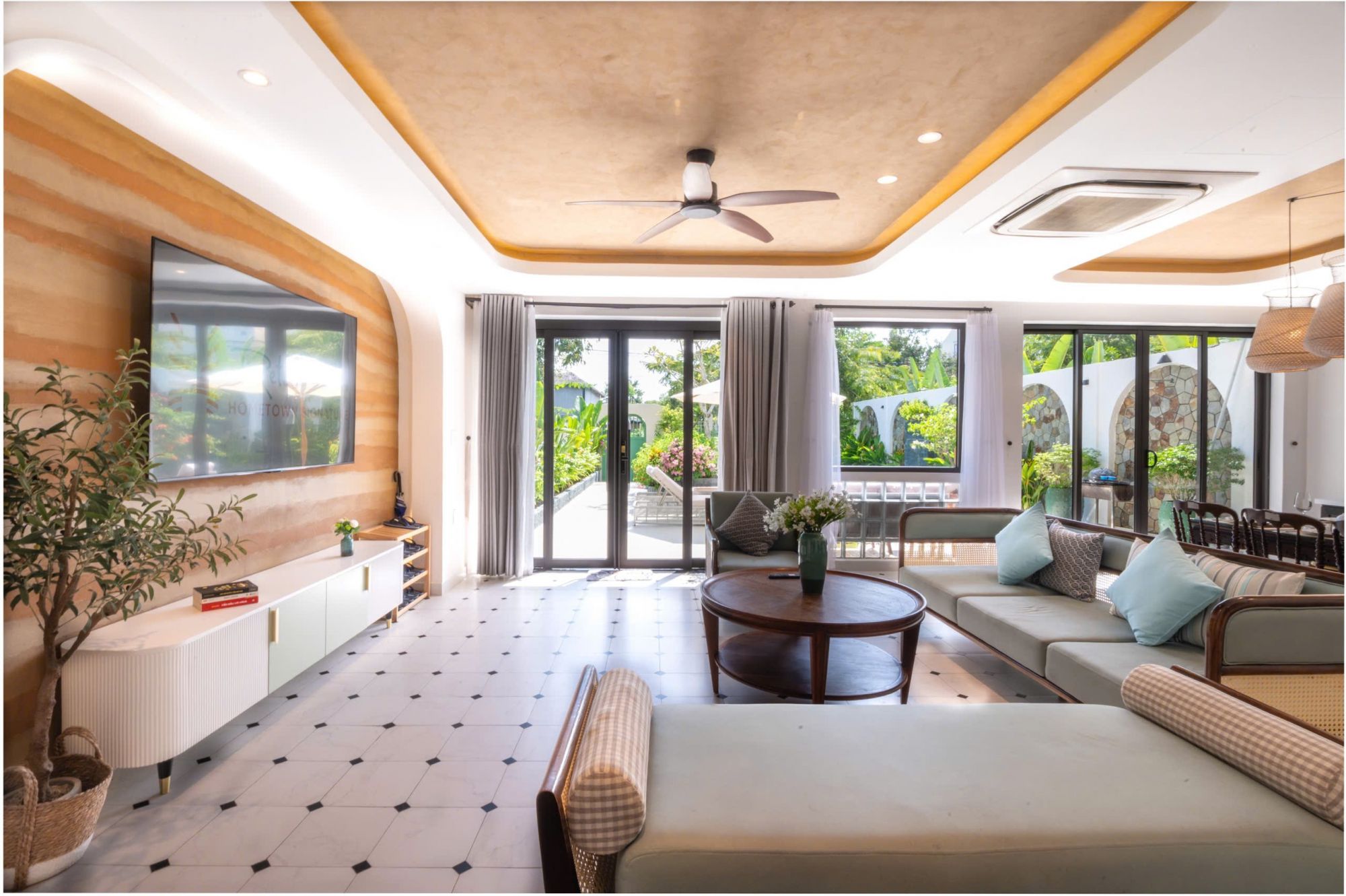Với diện tích khoảng 400m², Hometown Retreat Villa Hội An sở hữu không gian rộng rãi, thoáng mát, rất phù hợp cho các nhóm khách đông hoặc gia đình nhiều thế hệ. Villa gồm 6 phòng ngủ, mỗi phòng đều có phòng vệ sinh khép kín, được thiết kế theo phong cách hiện đại với nội thất tinh tế.