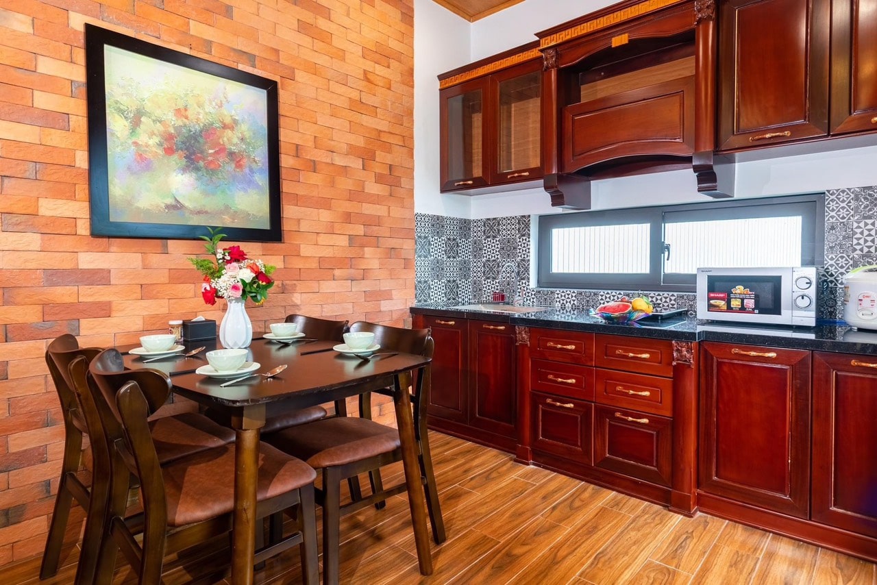 Villa sở hữu hồ bơi ngoài trời rộng rãi, mát mẻ, là nơi lý tưởng để thư giãn hoặc tổ chức các buổi tiệc BBQ sôi động. Khu vực bếp và lò nướng được trang bị tiện nghi đầy đủ, phục vụ mọi nhu cầu nấu nướng và tiệc tùng. Hệ thống phòng ốc rộng thoáng, tiện nghi hiện đại cùng ban công riêng ở mỗi phòng giúp bạn thoải mái ngắm nhìn cảnh thành phố Huế thơ mộng.