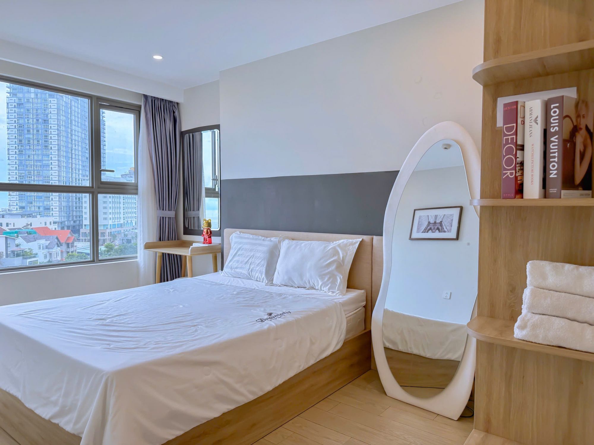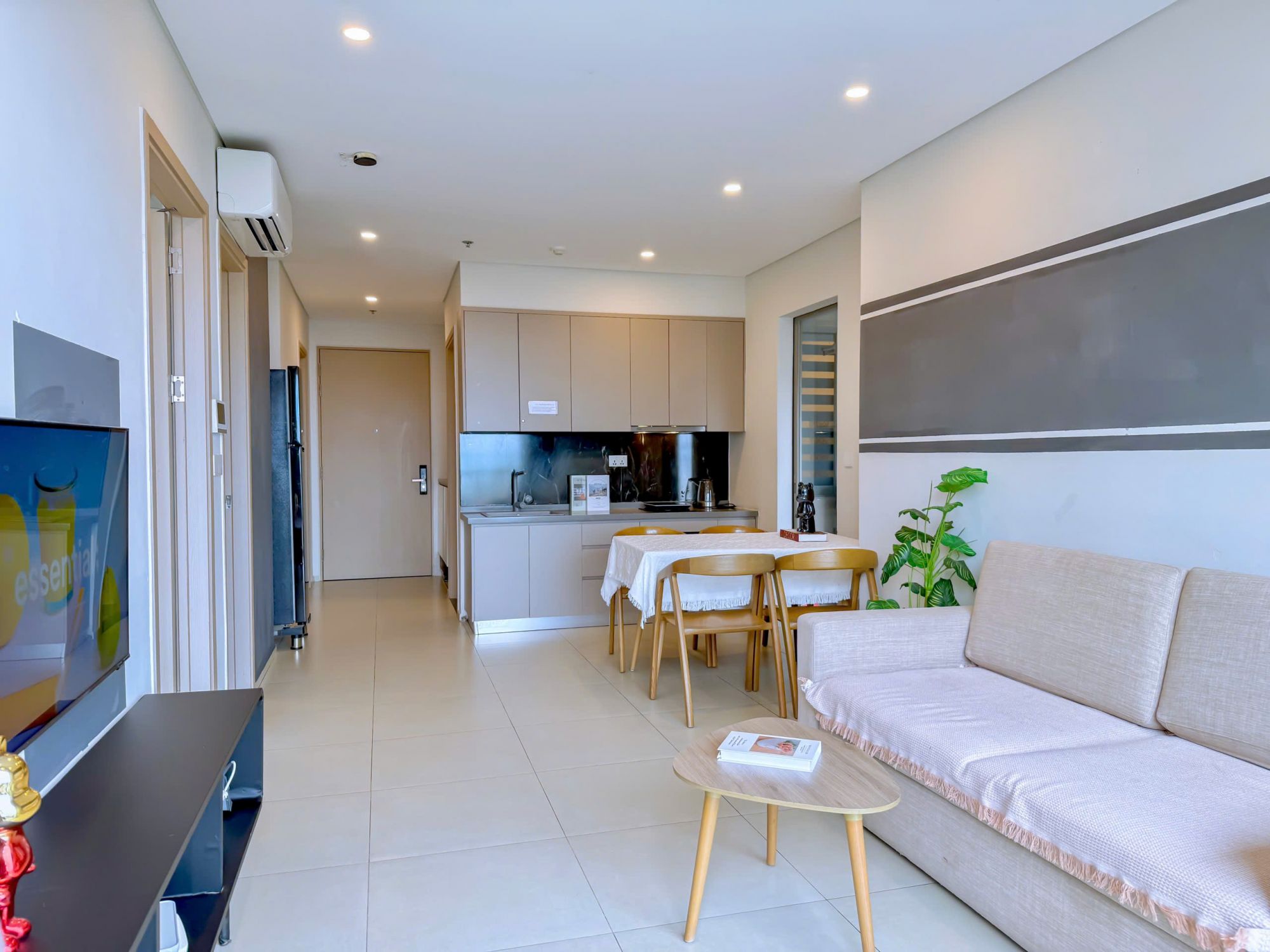 Căn hộ được thiết kế rộng rãi với diện tích 75m² gồm 3 phòng ngủ, 2 phòng vệ sinh, phù hợp cho nhóm đông người với 3 giường ngủ, 1 sofa giường và nệm thêm linh hoạt. Không gian bên trong được trang bị đầy đủ tiện nghi như bếp điện, máy hút mùi, tủ lạnh, máy giặt, TV, máy sấy tóc, đồ nấu ăn, khăn tắm, xà bông tắm cùng hệ thống tủ quần áo, bàn trang điểm và tủ giày giúp du khách sinh hoạt thoải mái như ở nhà.