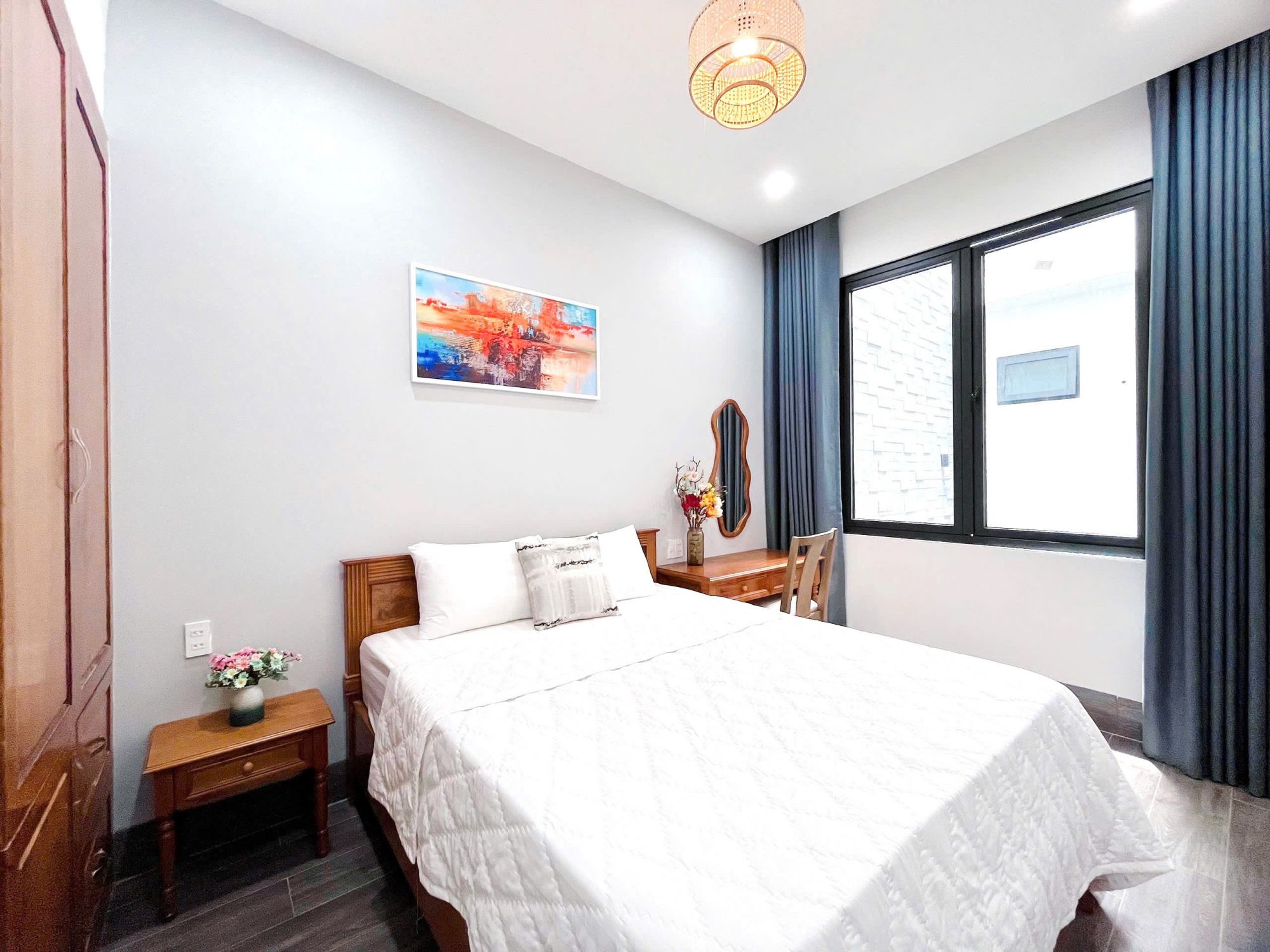 Hệ thống phòng ngủ tại Kito Villa - 1A Hồ Quý Ly được thiết kế theo phong cách tối giản nhưng tinh tế. Giường lớn, bố cục gọn gàng, ánh sáng dịu nhẹ qua rèm cửa mang lại cảm giác thư thái, yên tĩnh. Mỗi phòng đều đảm bảo sự riêng tư cần thiết, phù hợp cho cả nghỉ ngơi ngắn ngày lẫn lưu trú dài hơn.