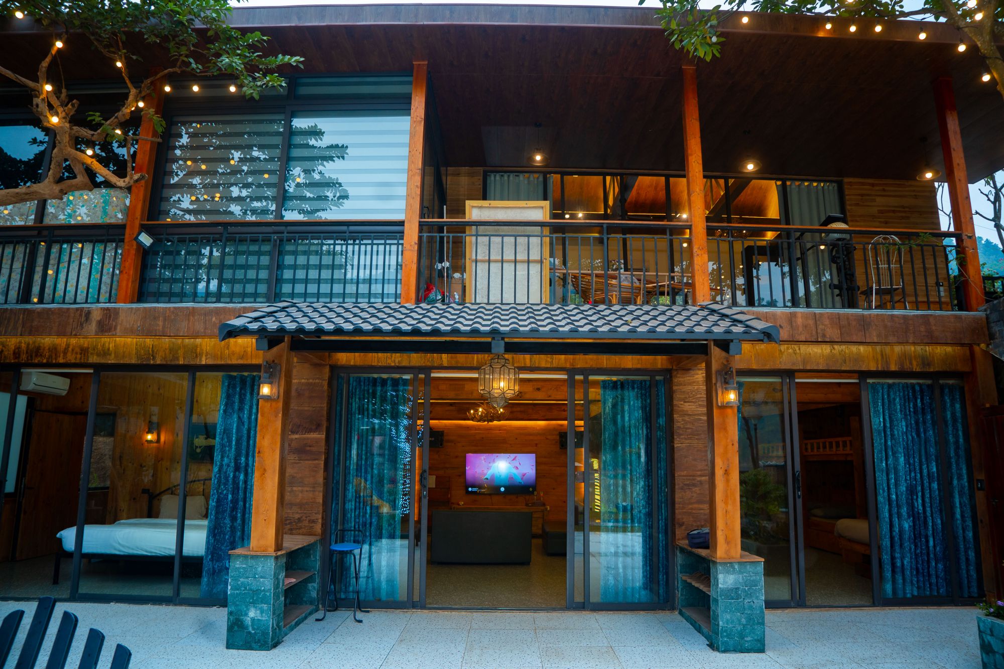 Khu villa gồm 2 phòng ngủ riêng, mỗi phòng bố trí 1 giường đôi, cùng 1 phòng cộng đồng giường tầng rộng rãi, đáp ứng linh hoạt cho nhóm đông người. Bên cạnh đó là khu phòng khách và phòng bếp đầy đủ tiện nghi, thuận tiện cho sinh hoạt chung, nấu nướng và tổ chức tiệc.