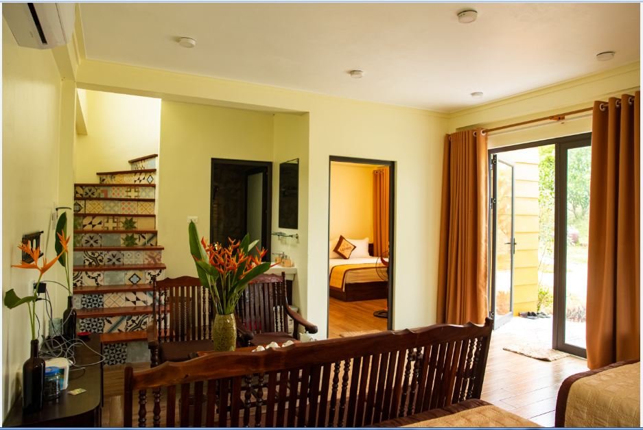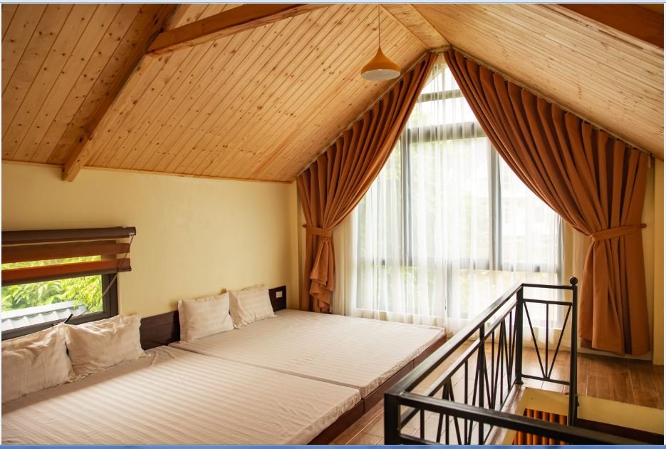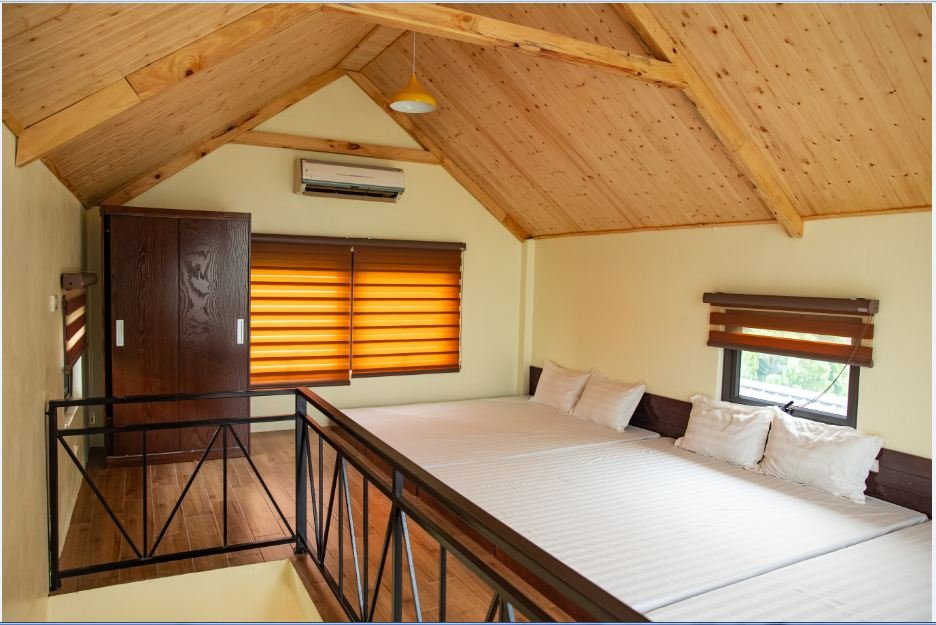 Villa gồm 1 phòng ngủ riêng, 2 phòng ngủ cộng đồng với tổng cộng 7 giường đôi, kèm theo 1 gác xép có thể kê thêm đệm phụ, đáp ứng linh hoạt nhu cầu lưu trú. Không gian phòng khách thoáng mát, khu vực bếp tiện nghi và sân ăn ngoài trời là điểm nhấn đặc biệt với tầm nhìn núi non đẹp mắt.