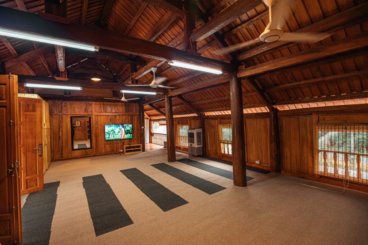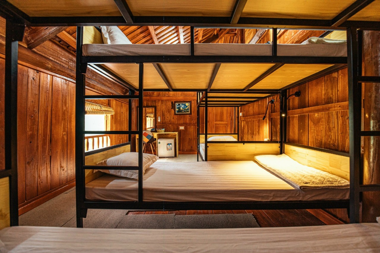 Nhà gỗ (Stilt House) mang đến không gian lưu trú độc đáo, gần gũi thiên nhiên với thiết kế nhà sàn thoáng đãng. Khu nhà gồm 2 phòng dorm giường tầng, 1 phòng sinh hoạt cộng đồng lớn, các phòng đều khép kín và trang bị điều hòa, sở hữu tầm nhìn thư giãn hướng suối và hồ.