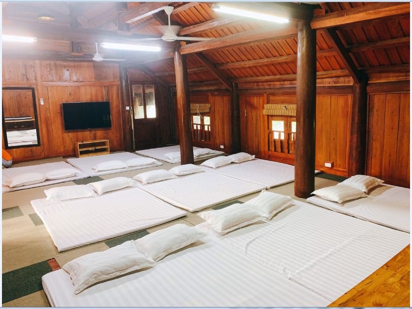 Nhà gỗ phù hợp tiêu chuẩn 25 khách và có thể đón tối đa đến 35 người, lý tưởng cho đoàn đông, team building hoặc kỳ nghỉ tập thể.