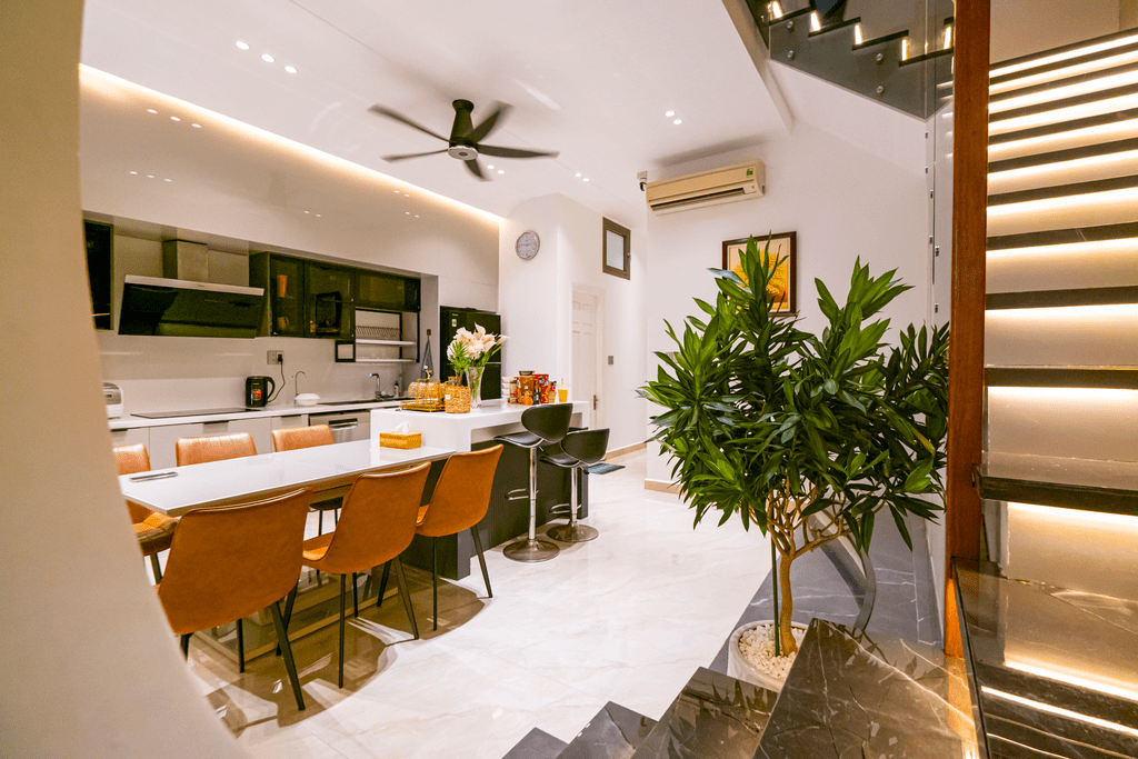 Tủ bếp tại Mallorie House cũng là một điểm nhấn ấn tượng khi được trang bị đầy đủ dụng cụ nấu ăn từ tủ lạnh, lò vi sóng, bếp từ, đến máy rửa chén hiện đại. Không chỉ vậy, khu vực này còn rất tiện lợi cho những gia đình muốn tự tay nấu nướng những bữa ăn ngon miệng, đảm bảo sự ấm cúng và gần gũi. Với không gian bếp hiện đại, bạn sẽ cảm thấy như đang ở chính ngôi nhà của mình, nhưng với một tiêu chuẩn tiện nghi lên đến 5 sao.