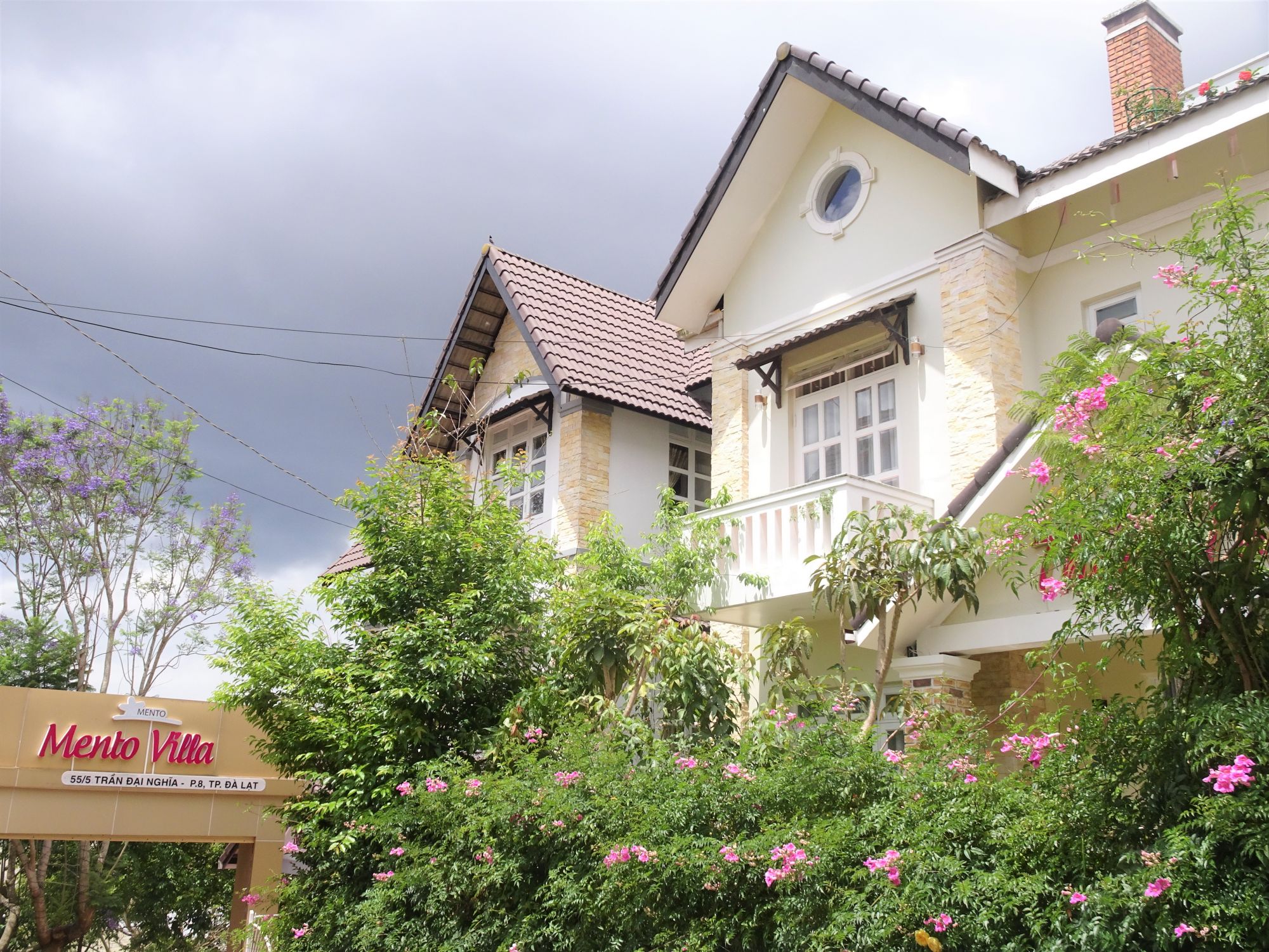 Ấn tượng đầu tiên tại Mento Villa là vẻ đẹp mang hơi hướng cổ điển, gợi nhớ những căn biệt thự xưa của Đà Lạt. Mái dốc, tường sáng màu và những khung cửa sổ lớn tạo nên một tổng thể thanh lịch nhưng rất đỗi gần gũi. Không gian sân vườn được chăm chút với nhiều cây xanh và hoa nở theo mùa, mang lại cảm giác mát lành và dễ chịu ngay khi bước vào.