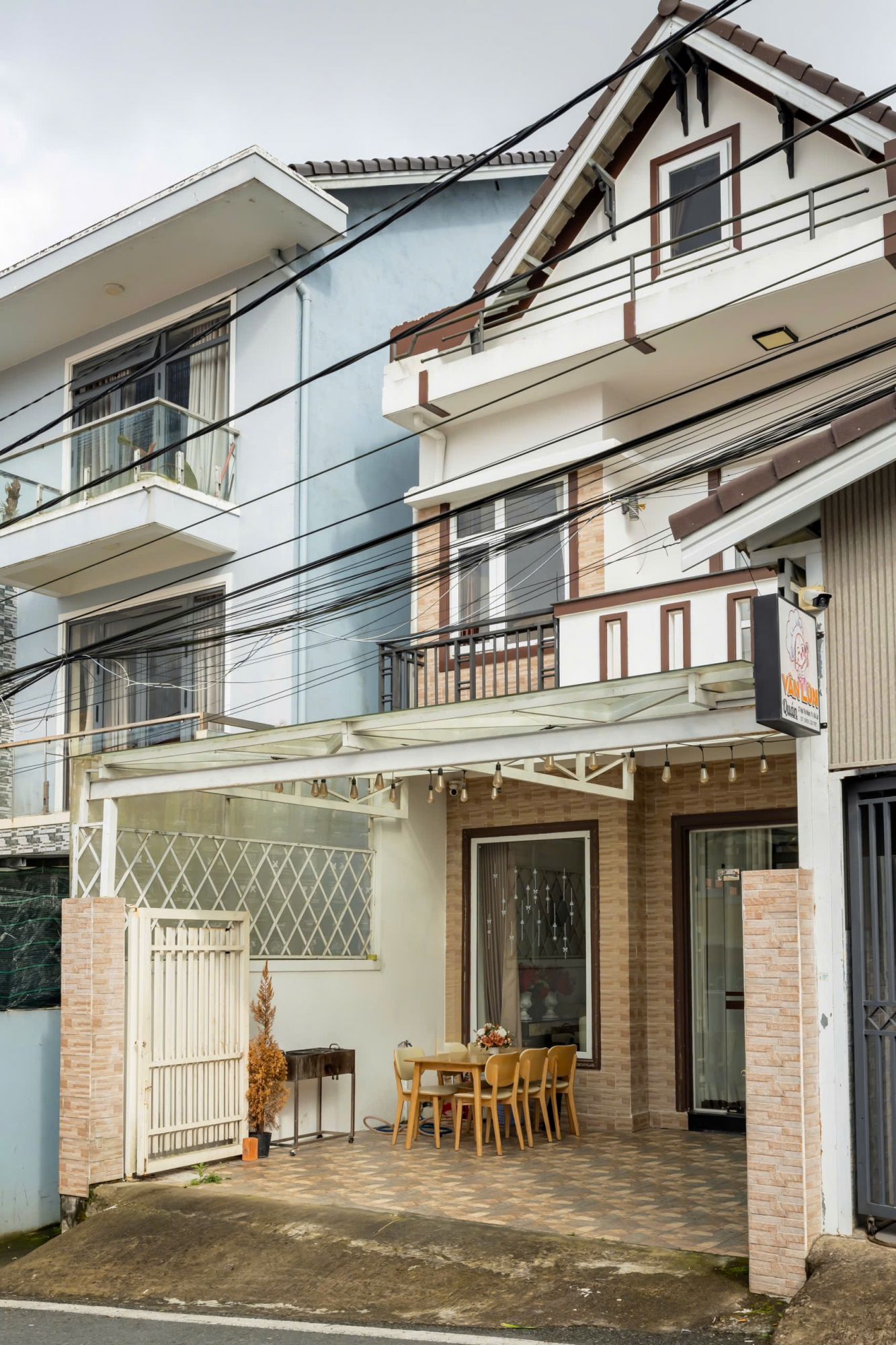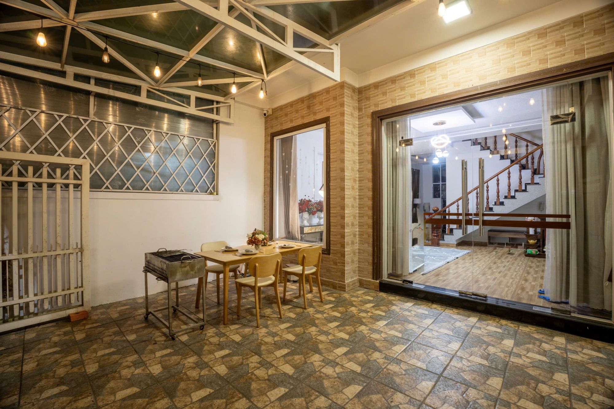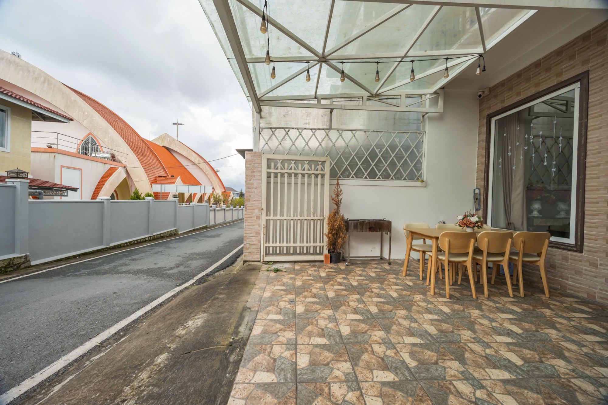 Khu vực sân BBQ được thiết kế rộng rãi, có mái che, thuận tiện cho việc tổ chức tiệc nướng ngoài trời dù thời tiết thay đổi. Đây là không gian lý tưởng để cùng nhau chuẩn bị bữa ăn, trò chuyện và tận hưởng không khí se lạnh đặc trưng của Đà Lạt trong một khung cảnh riêng tư và ấm cúng.