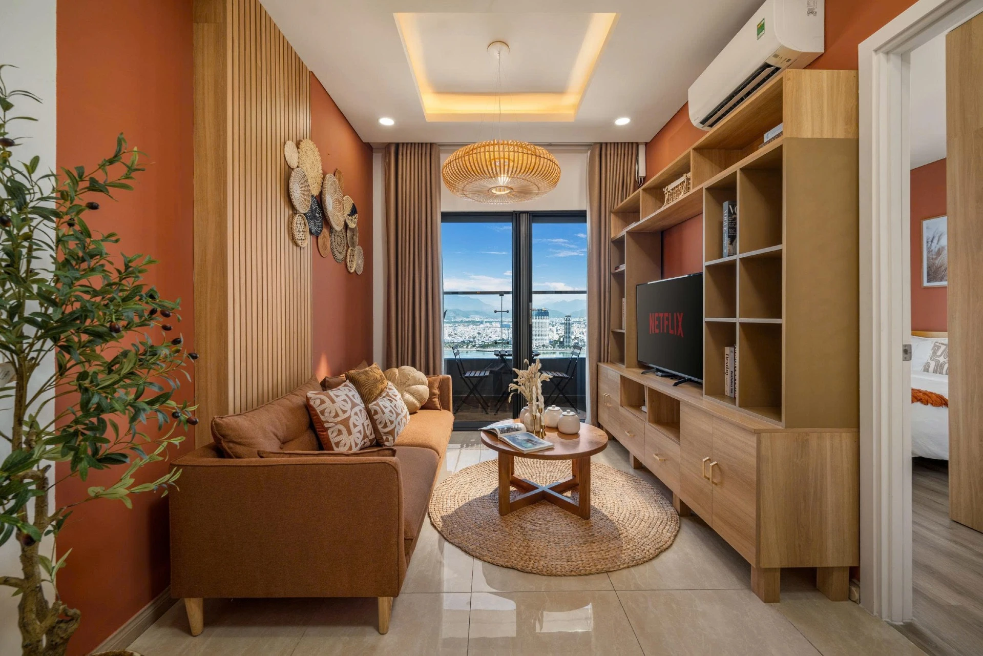 Bước vào căn hộ 2 phòng ngủ được thiết kế tinh tế, tông gạch nung và chất liệu tự nhiên tạo cảm giác ấm cúng và thư giãn. Từ tầng 27, chỉ vài phút từ sông Hàn và Cầu Rồng, căn hộ kết hợp giữa thẩm mỹ hiện đại và tiện nghi thực tế cho cuộc sống hàng ngày.