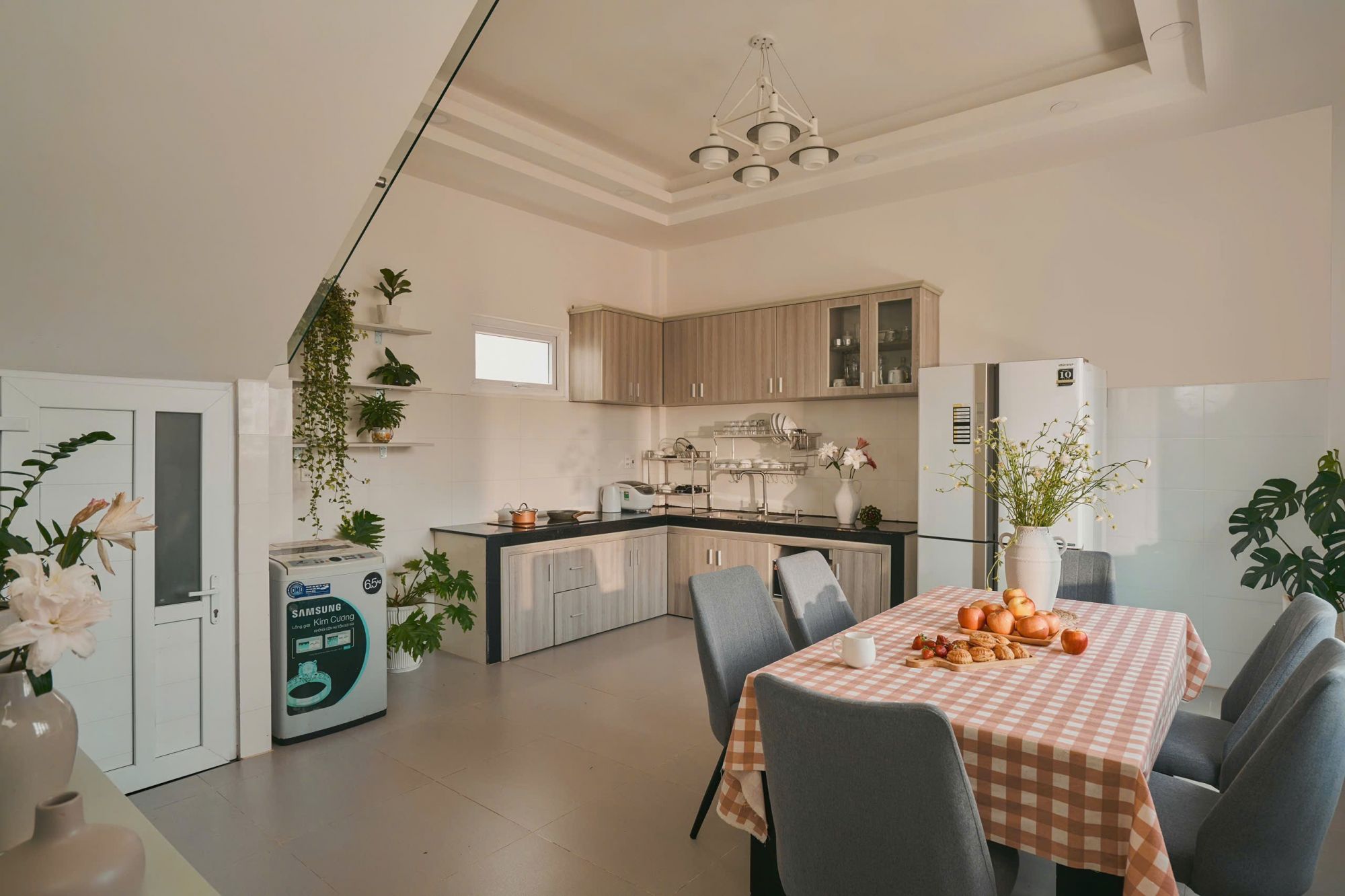Khu bếp rộng với đầy đủ dụng cụ nấu nướng là ưu điểm lớn dành cho những nhóm khách muốn tự tay chuẩn bị bữa ăn. Tủ lạnh, máy giặt, bàn ủi, máy sấy tóc cùng các vật dụng cần thiết đều được chuẩn bị đầy đủ, hỗ trợ kỳ nghỉ diễn ra thuận tiện và nhẹ nhàng. Việc sinh hoạt chung trong không gian ấm cúng này mang lại cảm giác gần gũi, tạo nên những khoảng thời gian gắn kết tự nhiên giữa các thành viên.