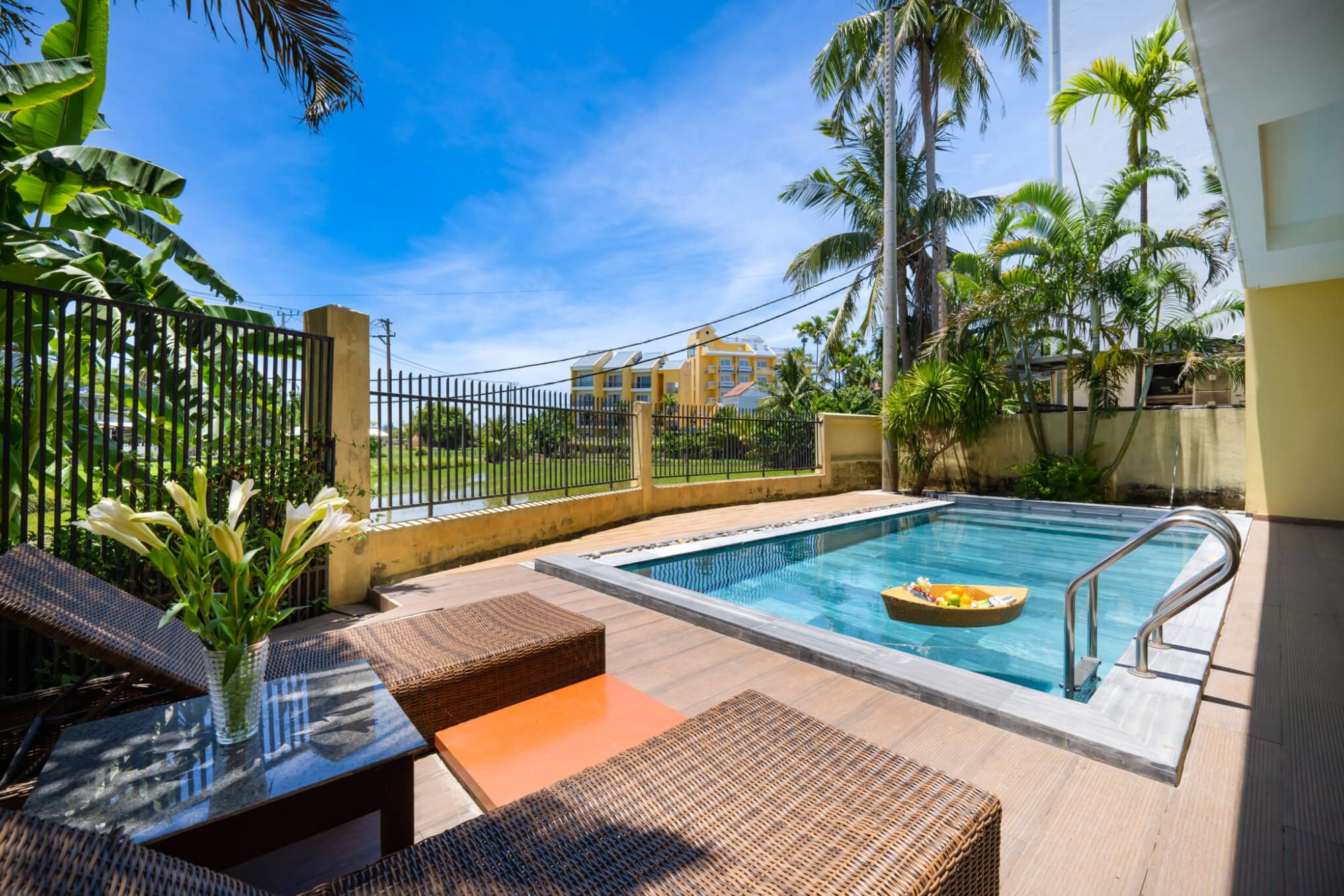 Một trong những điểm thu hút hàng đầu của Palm Village chính là hồ bơi ngoài trời rộng lớn. Nằm giữa không gian xanh mát, hồ bơi không chỉ là nơi để bạn thư giãn, tận hưởng làn nước mát lạnh mà còn là địa điểm lý tưởng để bạn ngắm nhìn khung cảnh cánh đồng lúa chín vàng. Đặc biệt, vào mùa lúa, khi những cánh đồng lúa trải rộng bát ngát, khung cảnh tại hồ bơi càng trở nên lãng mạn và thơ mộng hơn bao giờ hết.