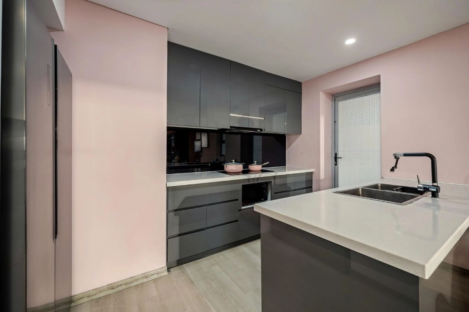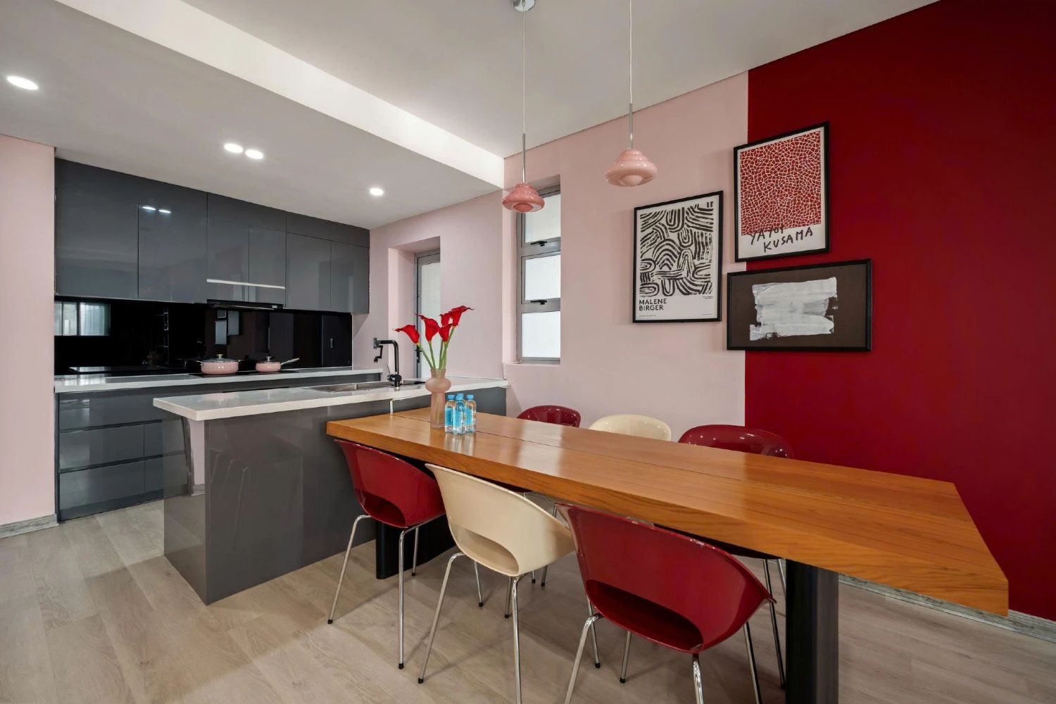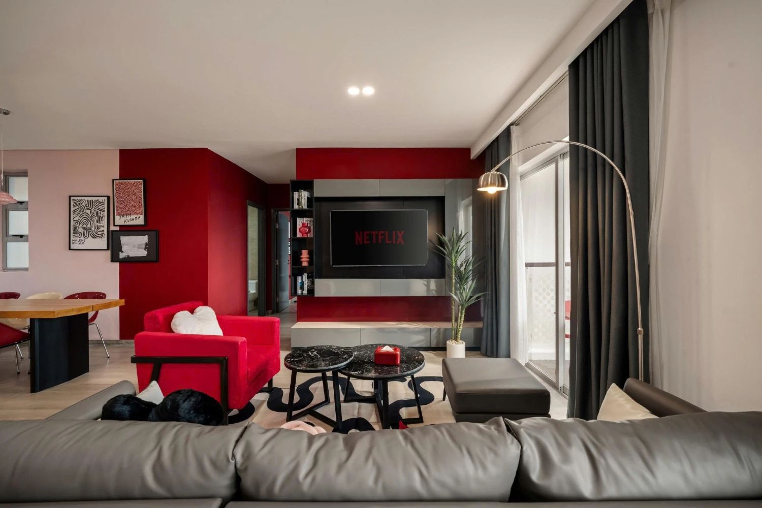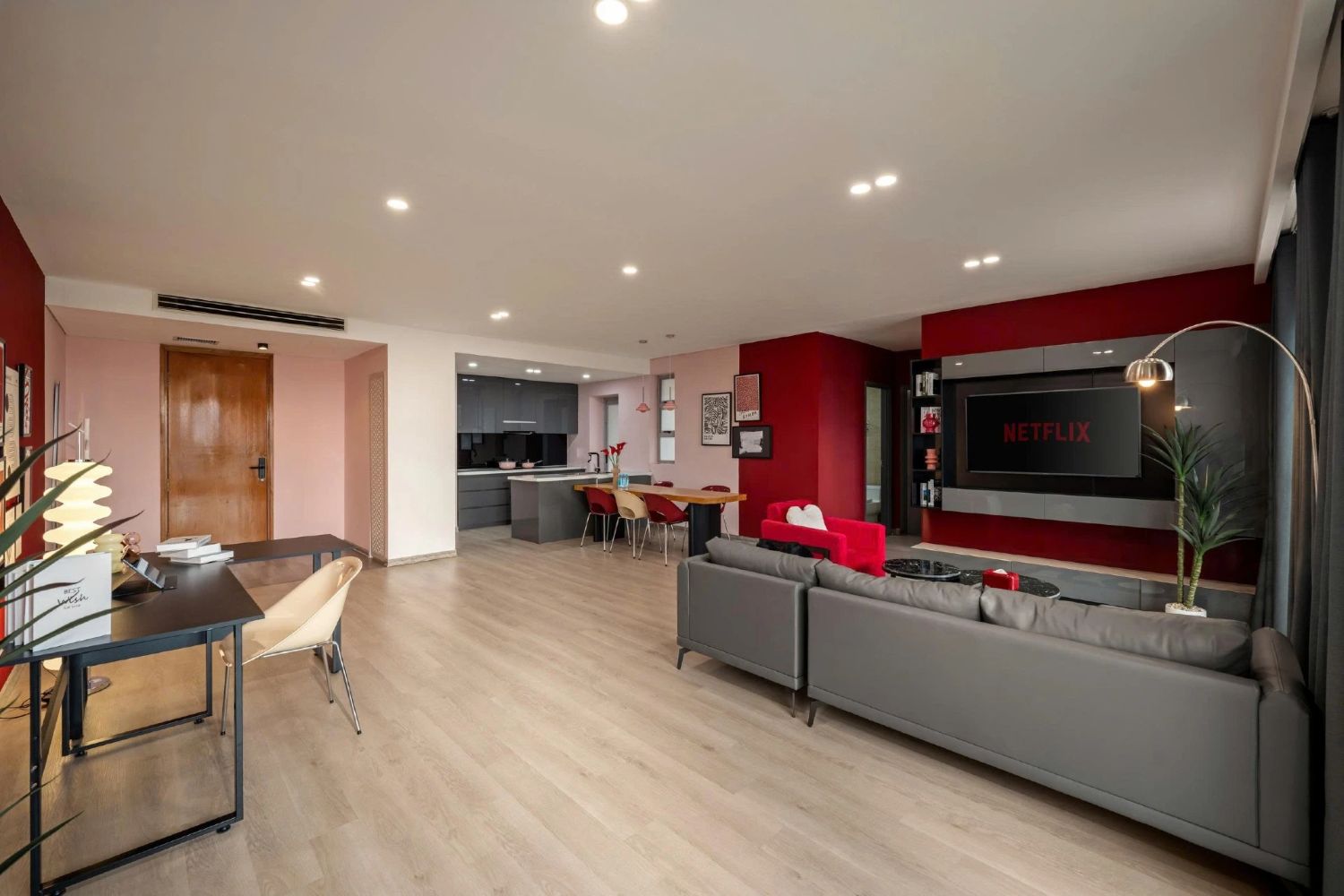 Không gian sống rộng rãi, tràn ngập ánh sáng tự nhiên, được thiết kế tinh tế với phong cách nghệ thuật Bauhaus và tông màu đỏ ấm áp, tạo nên bầu không khí sang trọng nhưng vẫn gần gũi. Phòng master với giường king, phòng tắm riêng và tầm nhìn tuyệt đẹp ra thành phố, bán đảo Sơn Trà và tượng Phật Bà, mang đến những khoảnh khắc bình yên khi bình minh hay hoàng hôn. Phòng ngủ thứ hai với giường queen nhìn ra cầu Sông Hàn và thành phố, cho cảm giác thư giãn giữa nhịp sống đô thị.