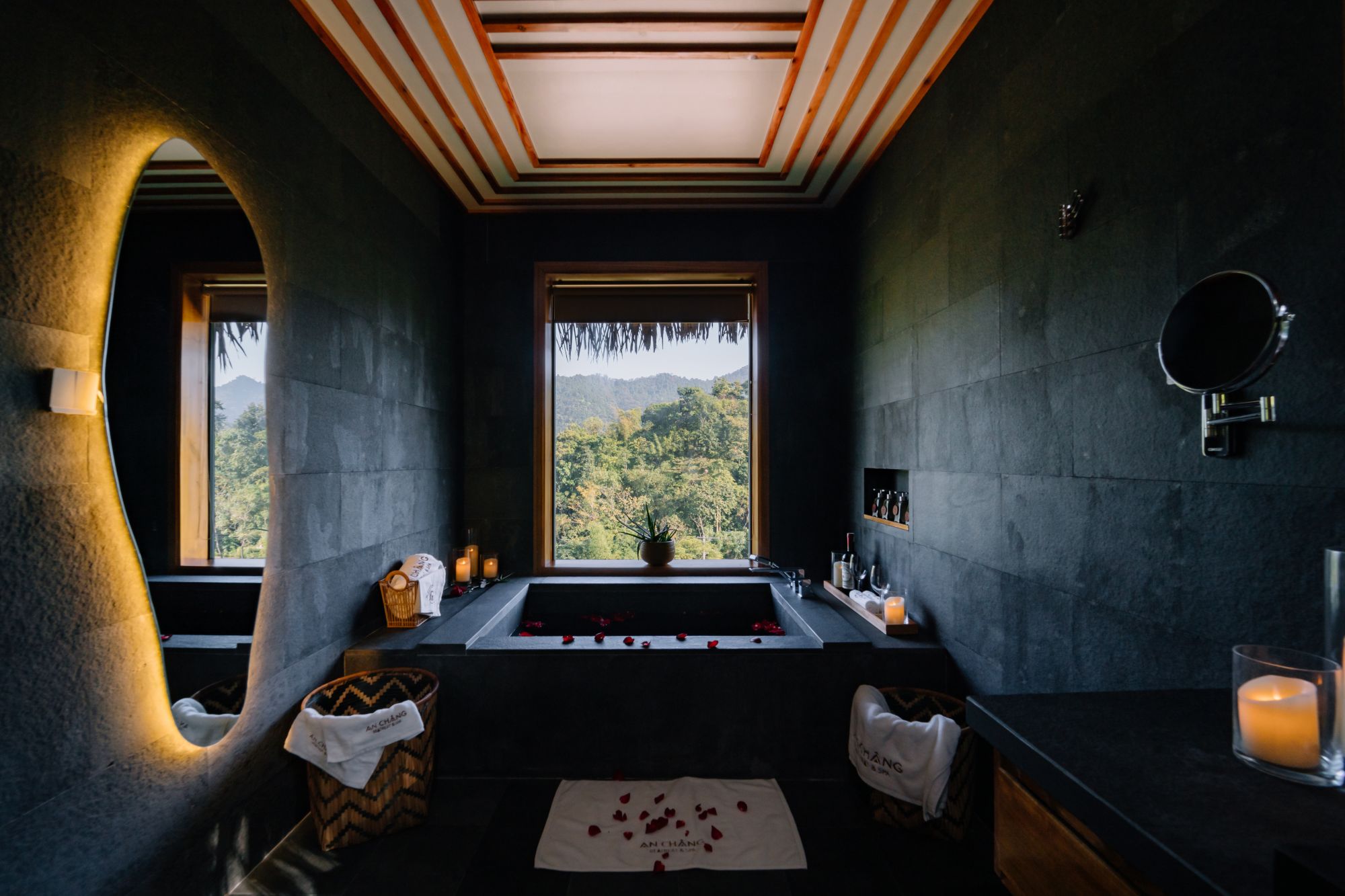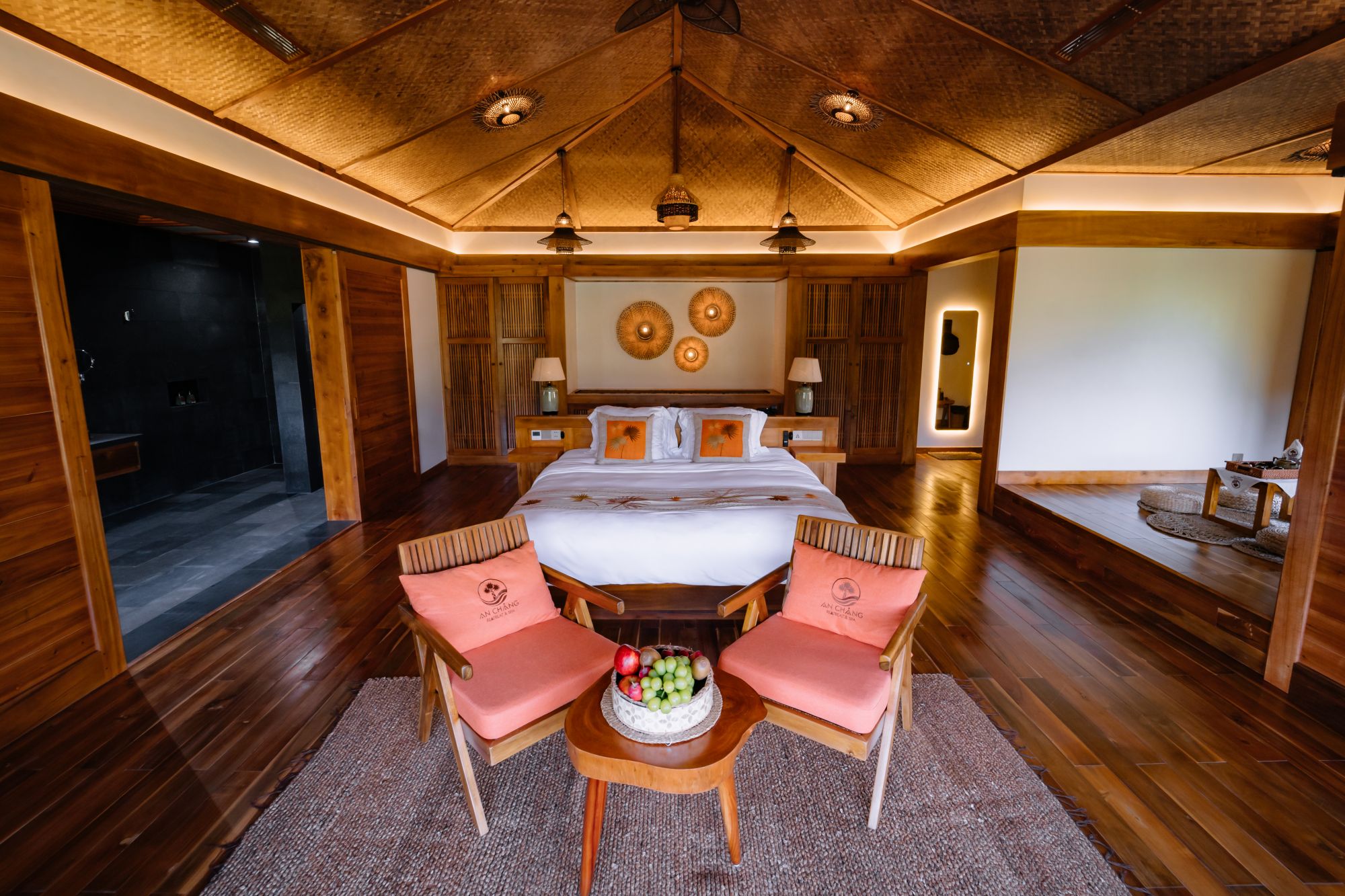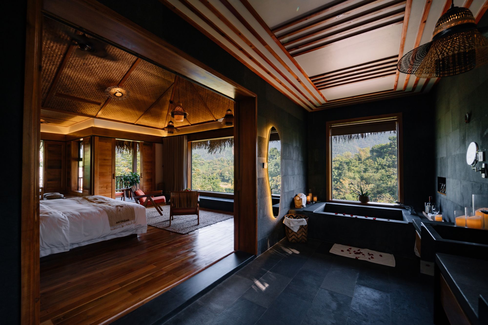 Mỗi căn Peony Mountainview đều được bố trí không gian tiếp khách riêng biệt, phù hợp cho những buổi trò chuyện nhẹ nhàng hoặc những phút thư giãn giữa ngày. Phòng tắm được trang bị bồn tắm đá tự nhiên – một điểm nhấn mang lại sự sang trọng, hòa hợp với thiên nhiên. Khu vực này được thiết kế thoáng, riêng tư và thoải mái, giúp trải nghiệm nghỉ dưỡng trở nên trọn vẹn hơn.