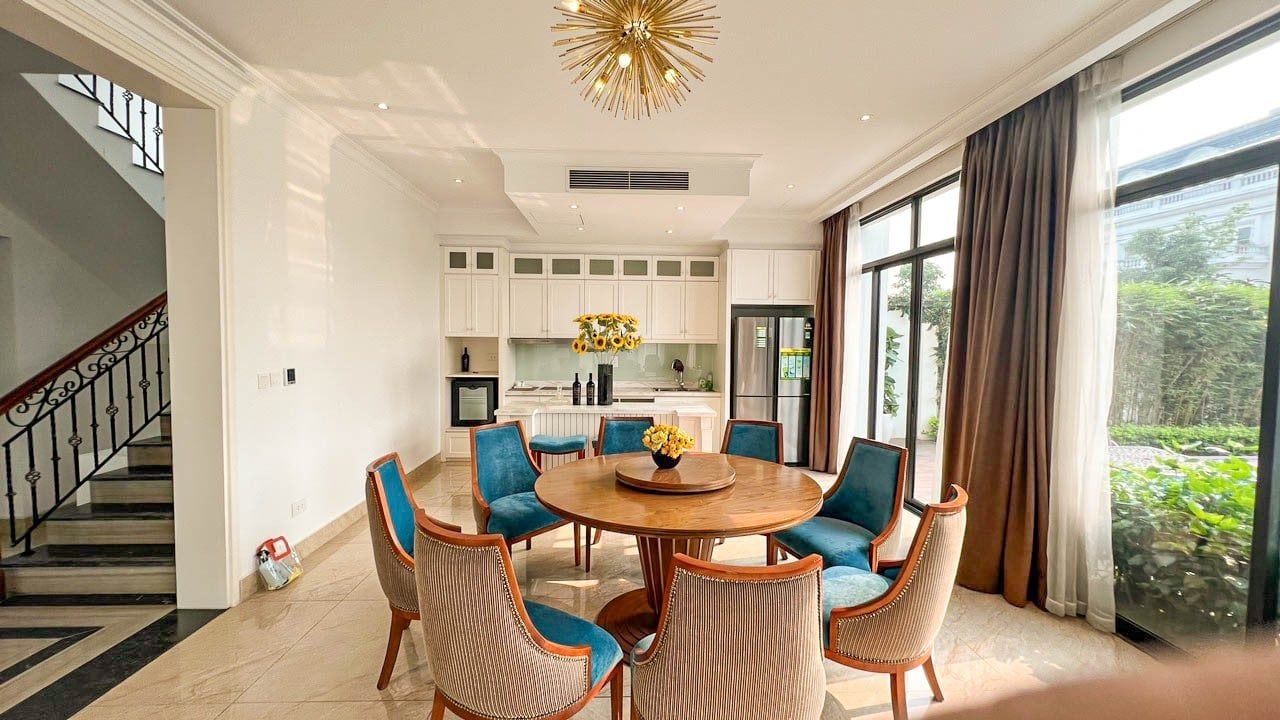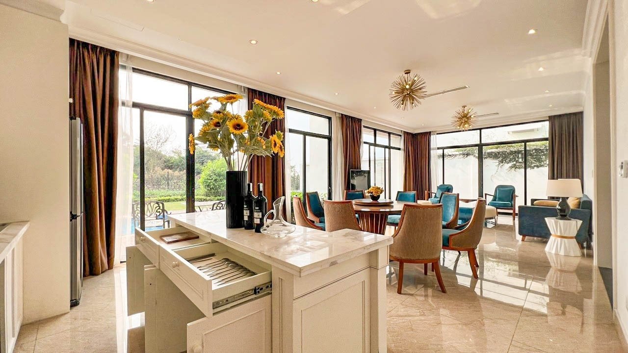 Phòng khách & bếp đầy đủ tiện nghi: Phòng khách lớn cùng bếp mở được trang bị đầy đủ các thiết bị nấu nướng như bếp từ, lò vi sóng, tủ lạnh, giúp bạn thoải mái chuẩn bị những bữa ăn ngon miệng.