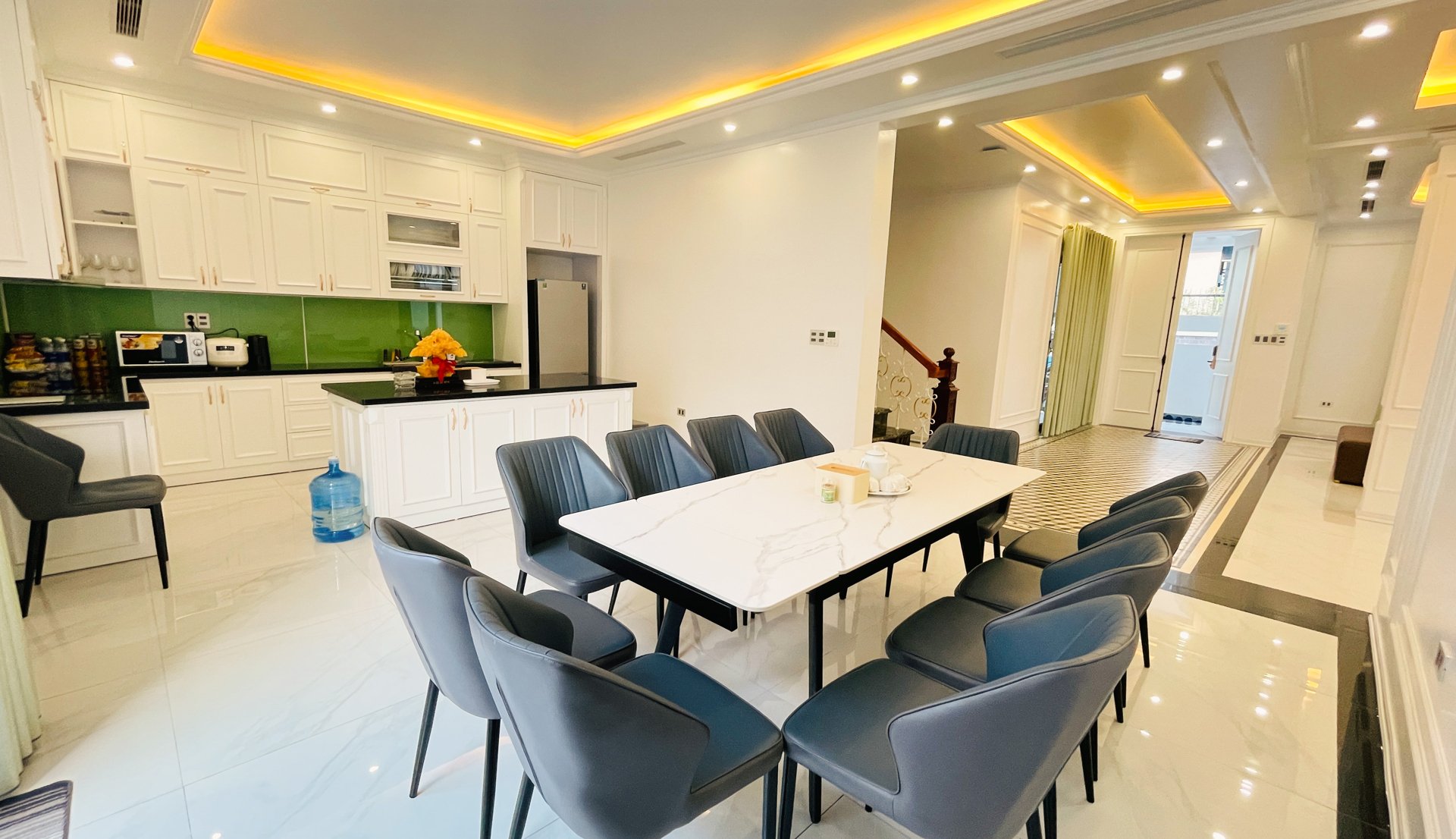 • Phòng khách & bếp mở: Khu vực chung lớn, đầy đủ tiện nghi với sofa, smart TV, bàn ăn dài, cùng bếp được trang bị đầy đủ các thiết bị nấu nướng cần thiết.