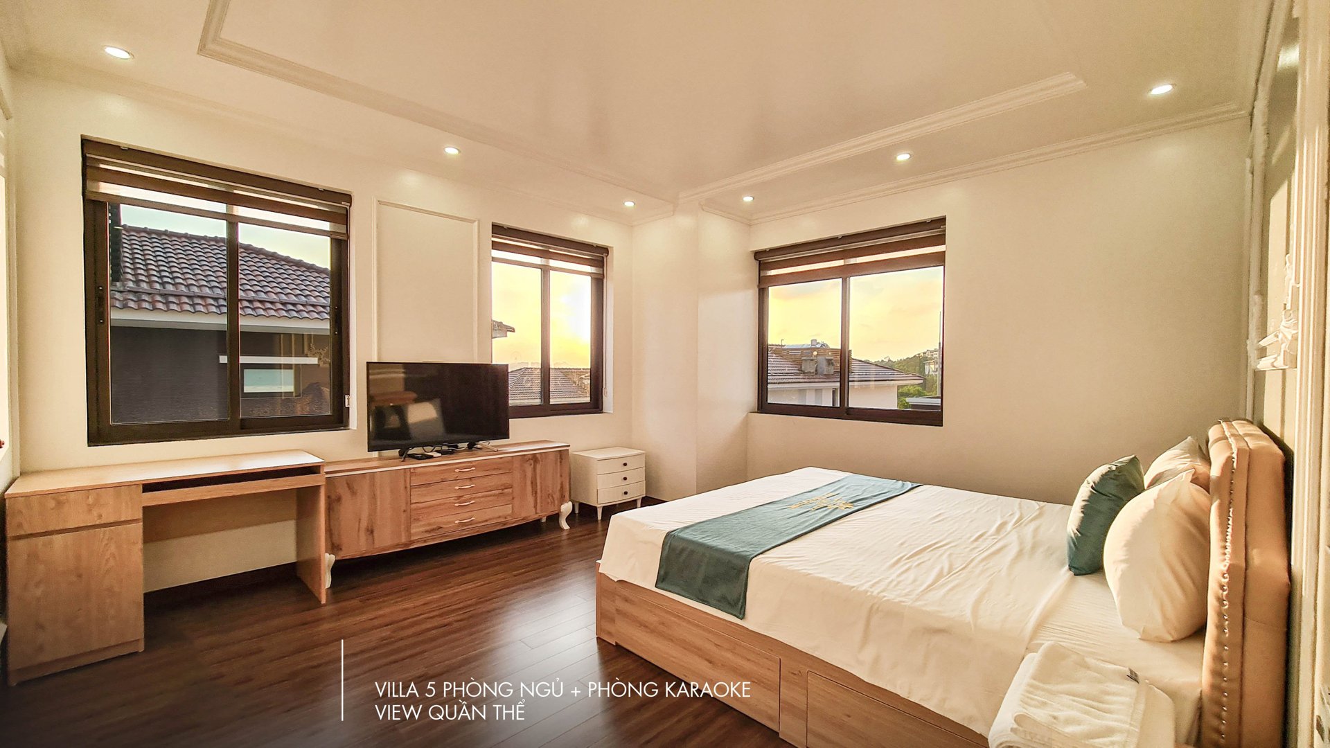 • 5 phòng ngủ rộng rãi: Tiêu chuẩn cho 10 người lớn và miễn phí trẻ em dưới 6 tuổi. Các phòng đều được trang bị đầy đủ điều hòa, WC, ban công riêng và tiện nghi chuẩn 5 sao.