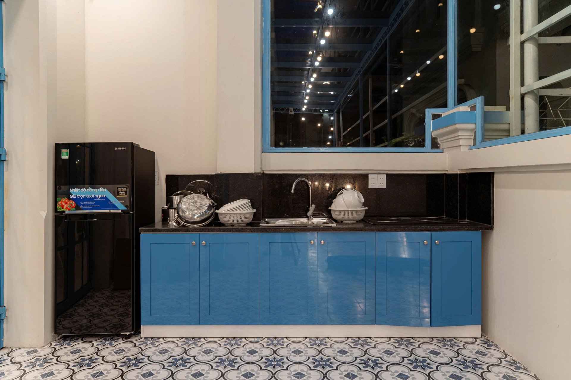 Bếp mở: Đầy đủ tiện nghi với bếp từ, lò vi sóng, tủ lạnh, cùng dụng cụ và gia vị nấu nướng.