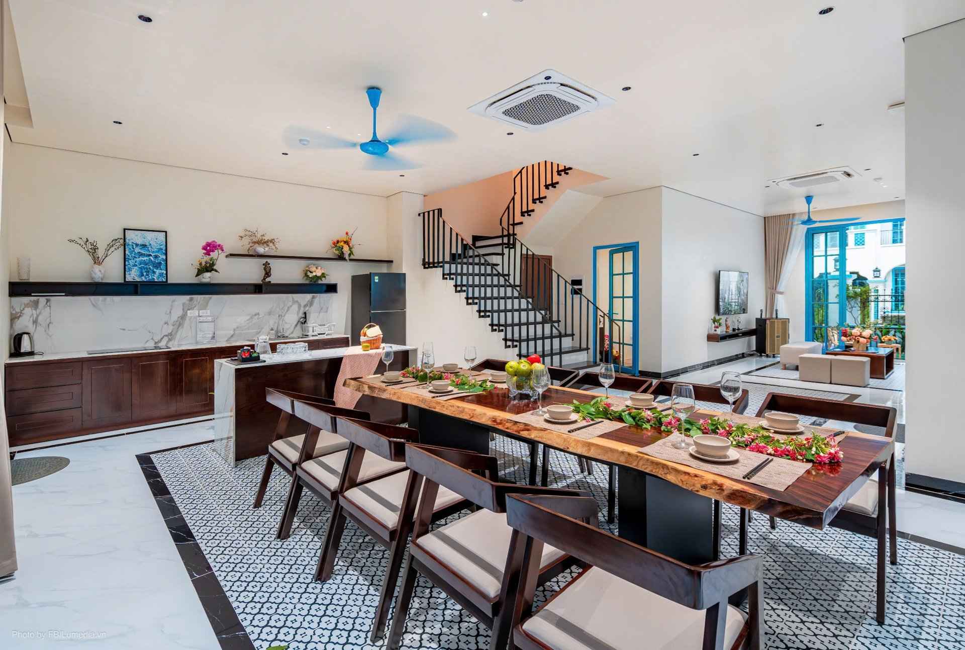 Phòng khách lớn và bếp mở: Được trang bị đầy đủ từ sofa, Smart TV, bàn ăn dài đến các thiết bị nấu nướng hiện đại như bếp từ, lò vi sóng, tủ lạnh, giúp bạn dễ dàng chuẩn bị bữa tiệc ấm cúng.