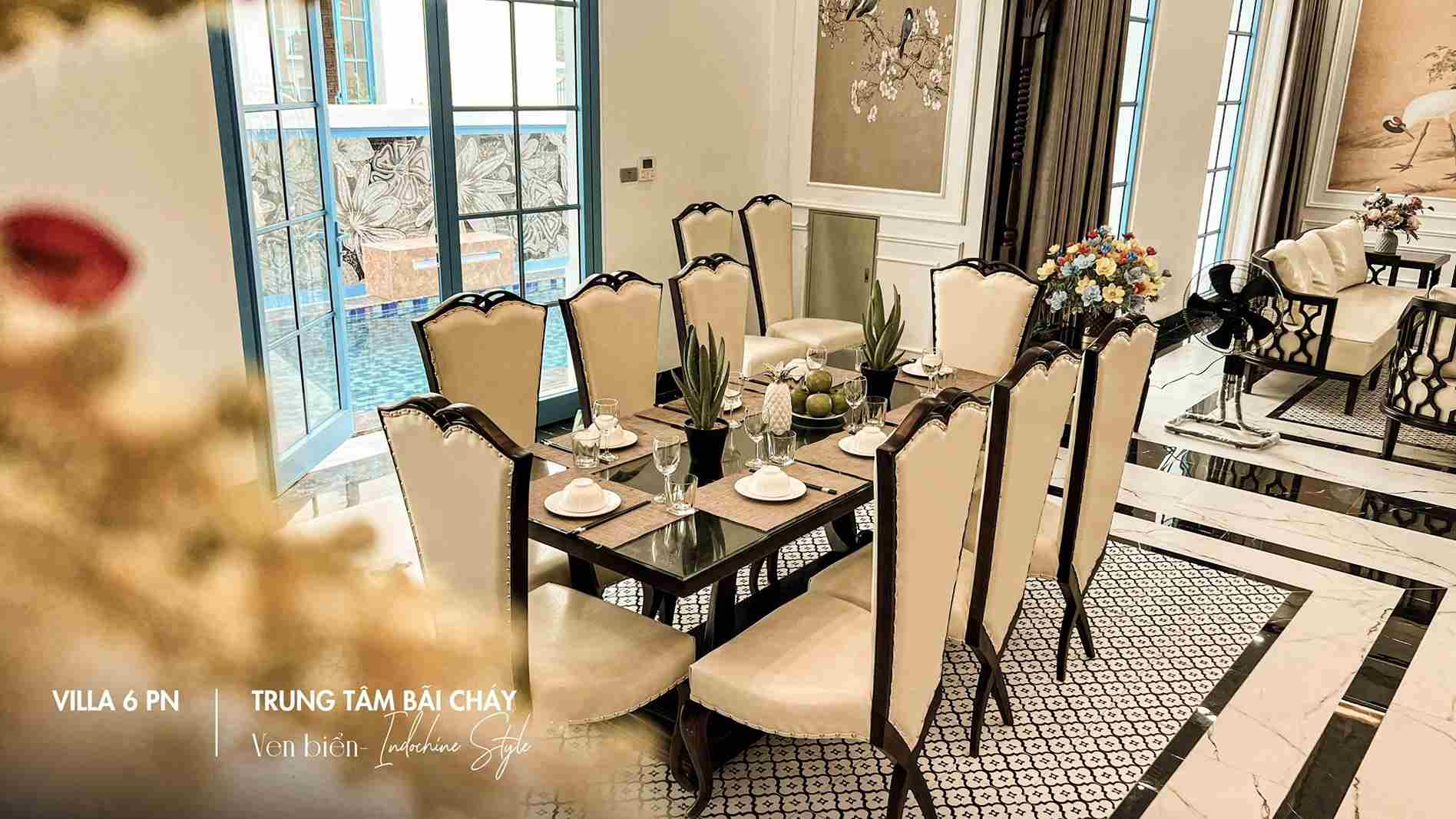 Thiết kế sang trọng: Villa mang phong cách Địa Trung Hải tinh tế kết hợp với nội thất Indochine hiện đại, nhiều cửa kính lớn đón ánh sáng & gió biển tự nhiên - tạo cảm giác thư giãn tuyệt đối.