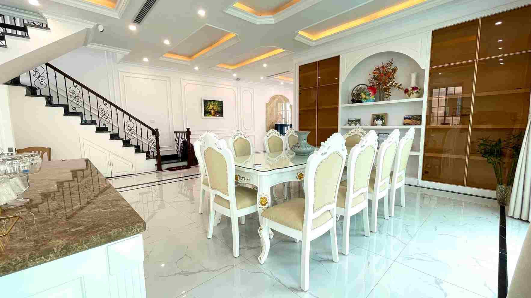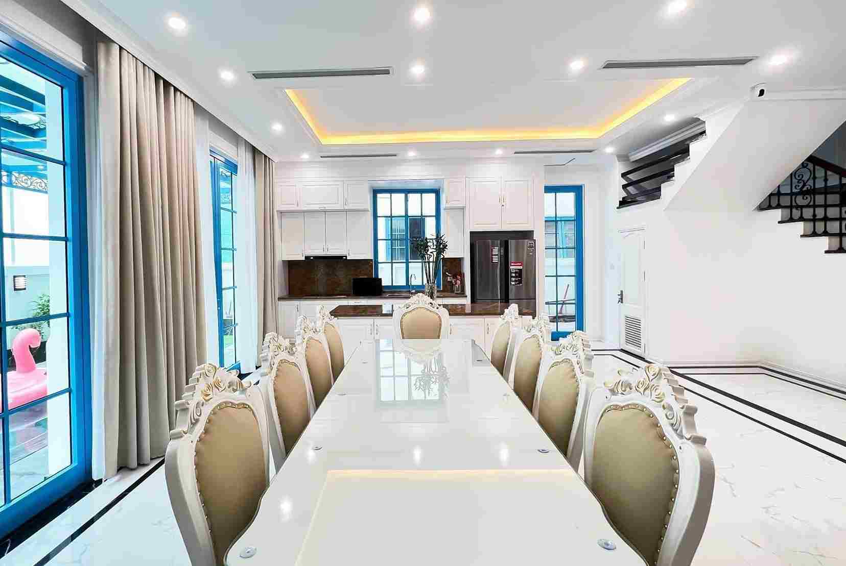 Phòng khách lớn và bếp mở: Được trang bị đầy đủ từ sofa, Smart TV, bàn ăn dài đến các thiết bị nấu nướng hiện đại, giúp bạn dễ dàng chuẩn bị bữa tiệc ấm cúng.