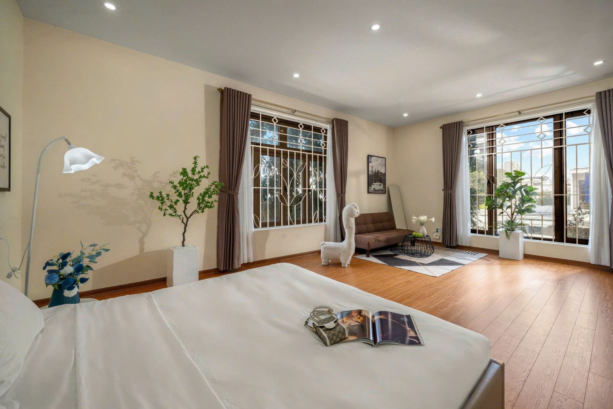 Villa có thiết kế hiện đại, trang bị điều hòa, gồm 5 phòng ngủ rộng rãi, sân hiên nhìn ra khu vườn xanh mát và khu bếp đầy đủ tiện nghi. Phòng khách được bố trí TV màn hình phẳng, tạo cảm giác thoải mái như ở nhà.