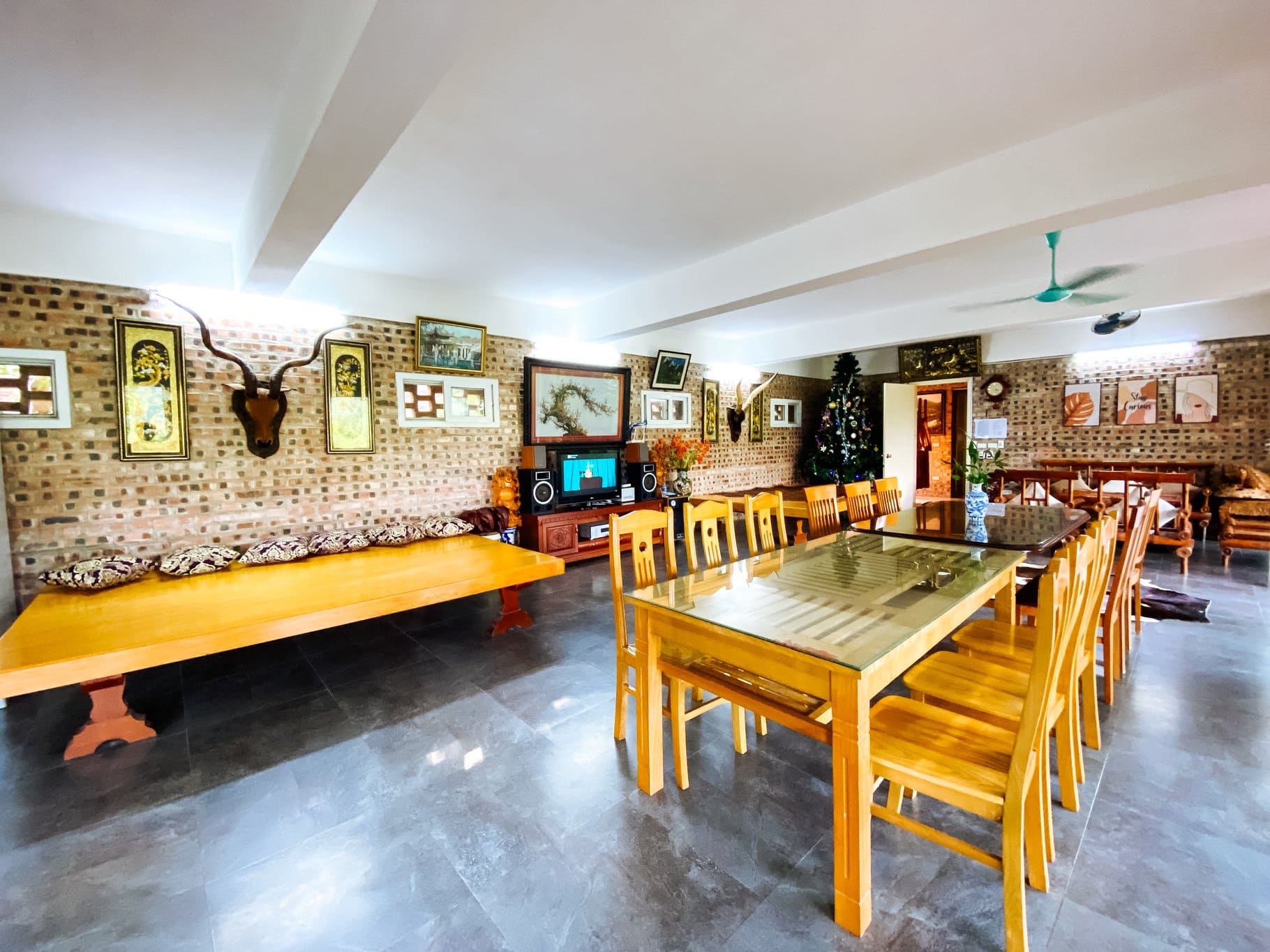 Không gian rộng rãi: 1 phòng khách sinh hoạt chung 100m² ở tầng 1 và 1 phòng khách riêng tư ở tầng 2 với TV, wifi, điều hòa, sofa.
