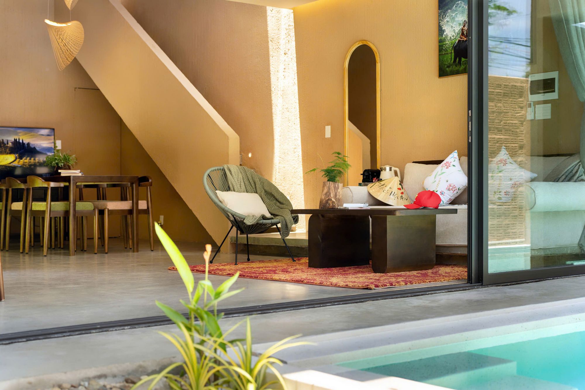 Phòng khách rộng rãi là điểm cộng lớn, tạo không gian sinh hoạt chung thoải mái, phù hợp cho những buổi quây quần, trò chuyện và thư giãn. Tổng thể Q Sand Villa mang đến trải nghiệm nghỉ dưỡng cân bằng giữa sự riêng tư, tiện nghi và không gian xanh mát, lý tưởng cho một chuyến đi trọn vẹn tại Hội An.