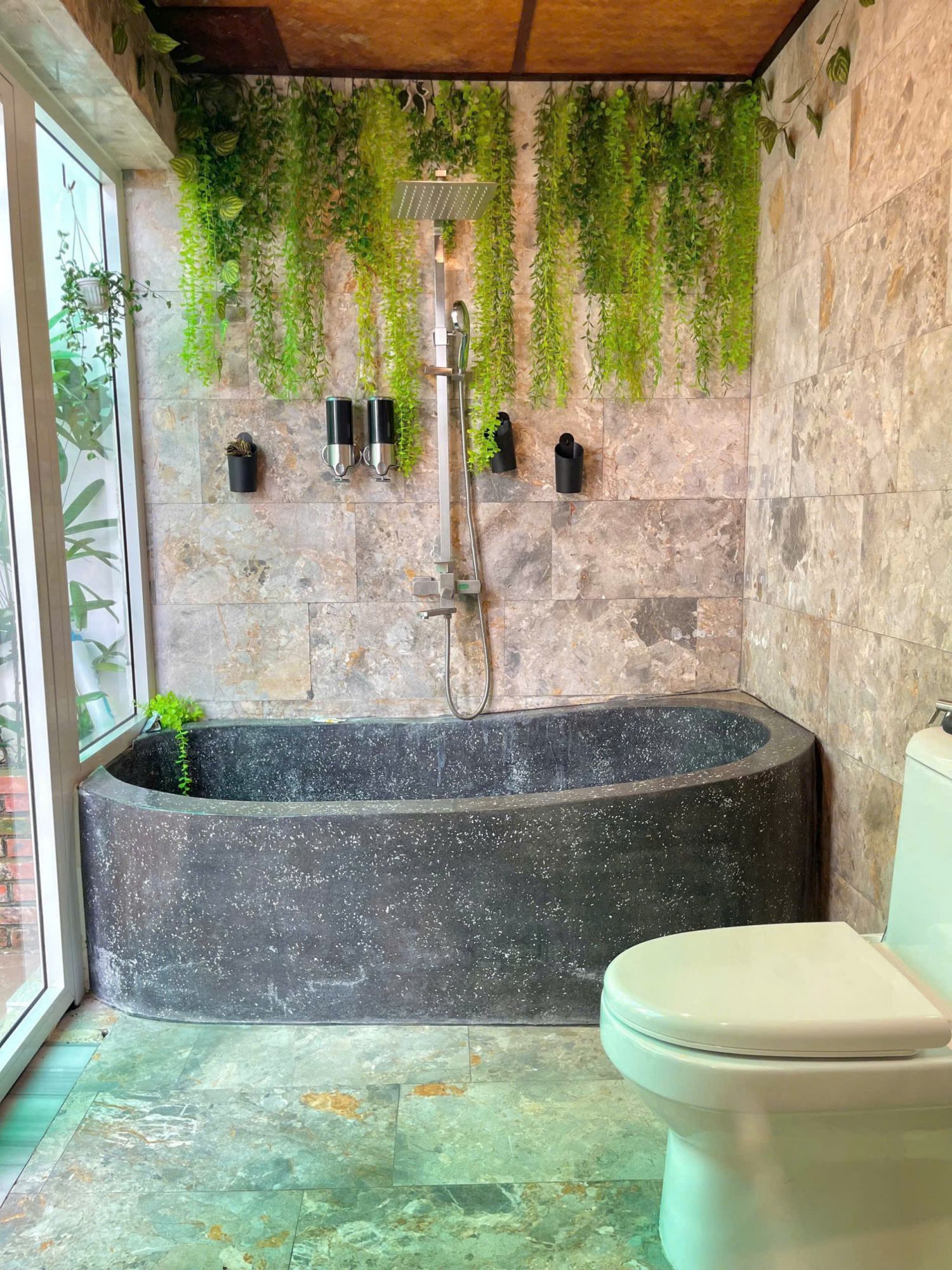 Villa gồm 5 phòng ngủ với 5 giường 1m8 và 1 giường 1m, phù hợp cho nhóm gia đình hoặc bạn bè đông người. Hai phòng tầng trệt được trang bị bồn tắm nằm, mang lại trải nghiệm thư giãn riêng tư sau một ngày vui chơi.