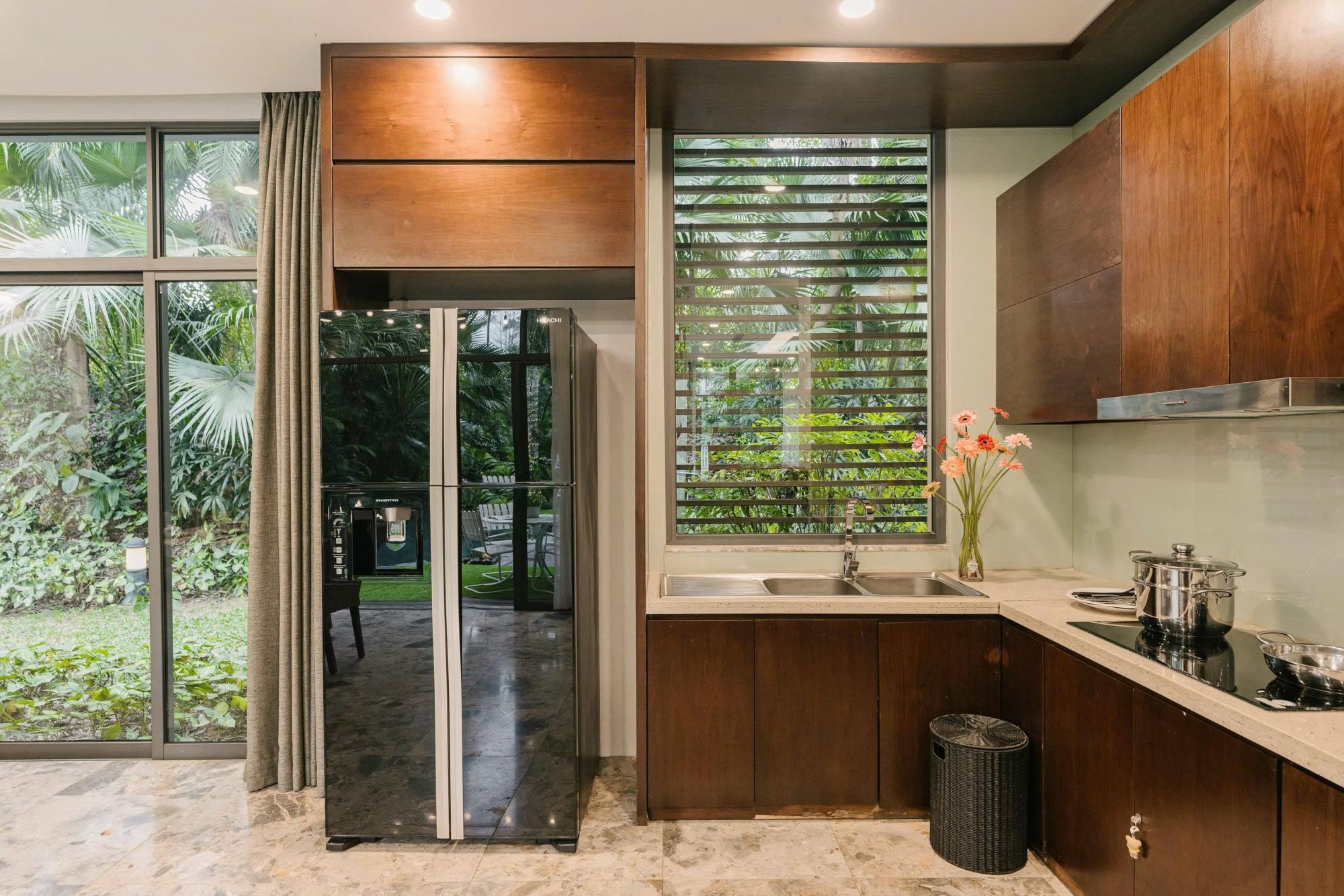 - Bếp đầy đủ dụng cụ từ bát đũa, ly vang đến bếp lẩu, lò nướng BBQ, điều hòa âm trần... sẵn sàng cho những bữa tiệc ấm cúng.