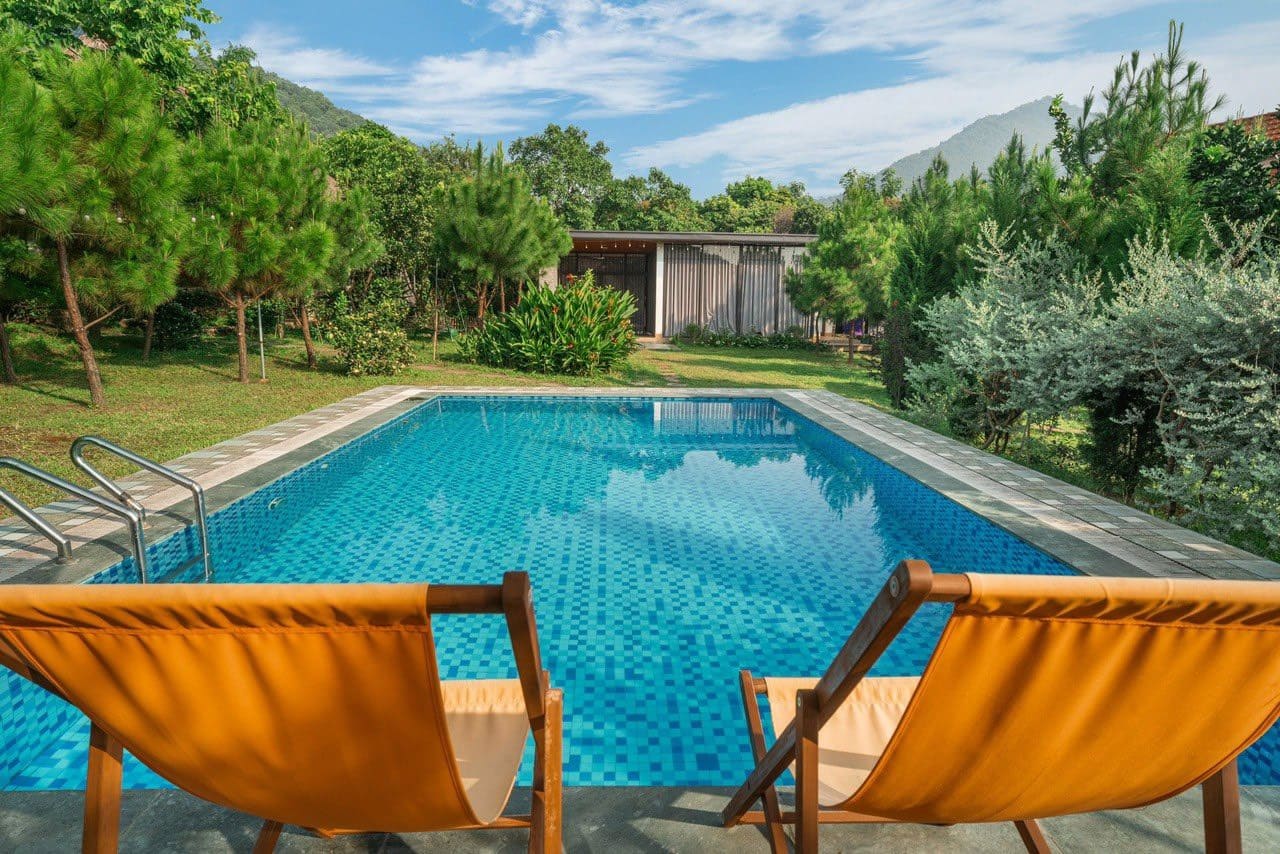 Bể bơi riêng tư view rừng thông: Đắm mình trong làn nước mát lạnh của bể bơi riêng với kích thước 4.5m x 8m, sâu 1.4m. Đặc biệt, bạn sẽ được tận hưởng khung cảnh rừng thông xanh mướt bao quanh, tạo nên một không gian thư giãn "siêu chill" có 1-0-2.