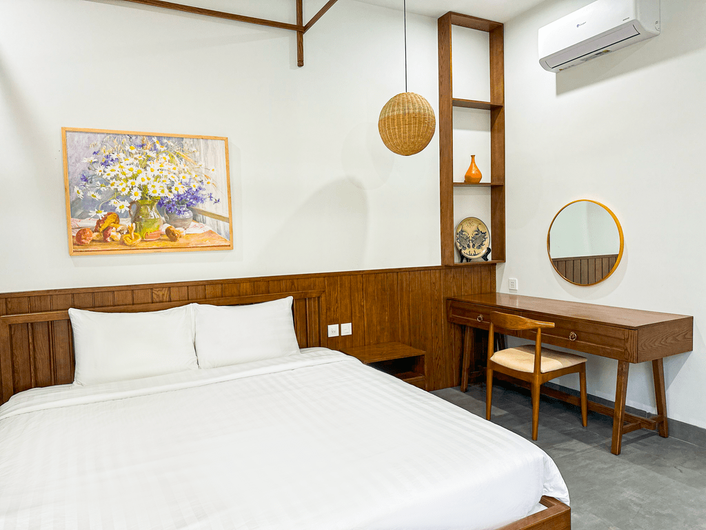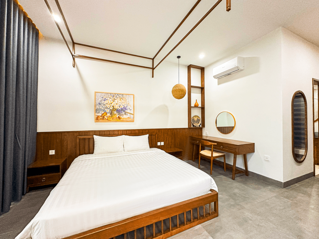 Villa có diện tích rộng 300m², nguyên căn gồm 4 phòng ngủ với thiết kế sang trọng, mỗi phòng đều có giường đôi cỡ lớn 1m8 và nhà vệ sinh riêng. Phòng master đặc biệt có đến 2 bồn tắm sang trọng giúp bạn thư giãn tối đa sau một ngày dài khám phá phố cổ.