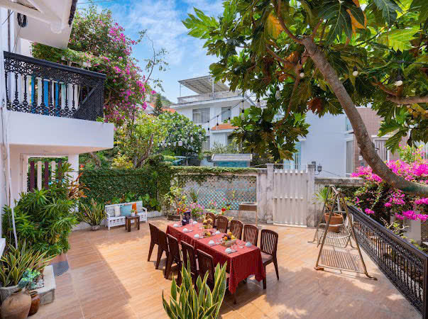 Khu sân vườn của Sky Villa 2 được thiết kế xanh mát, là nơi lý tưởng để tổ chức tiệc BBQ hoặc các buổi chill nhẹ nhàng bên hồ bơi. Không khí trong lành cùng ánh đèn lung linh vào buổi tối tạo nên không gian nghỉ dưỡng vừa gần gũi vừa sang trọng.