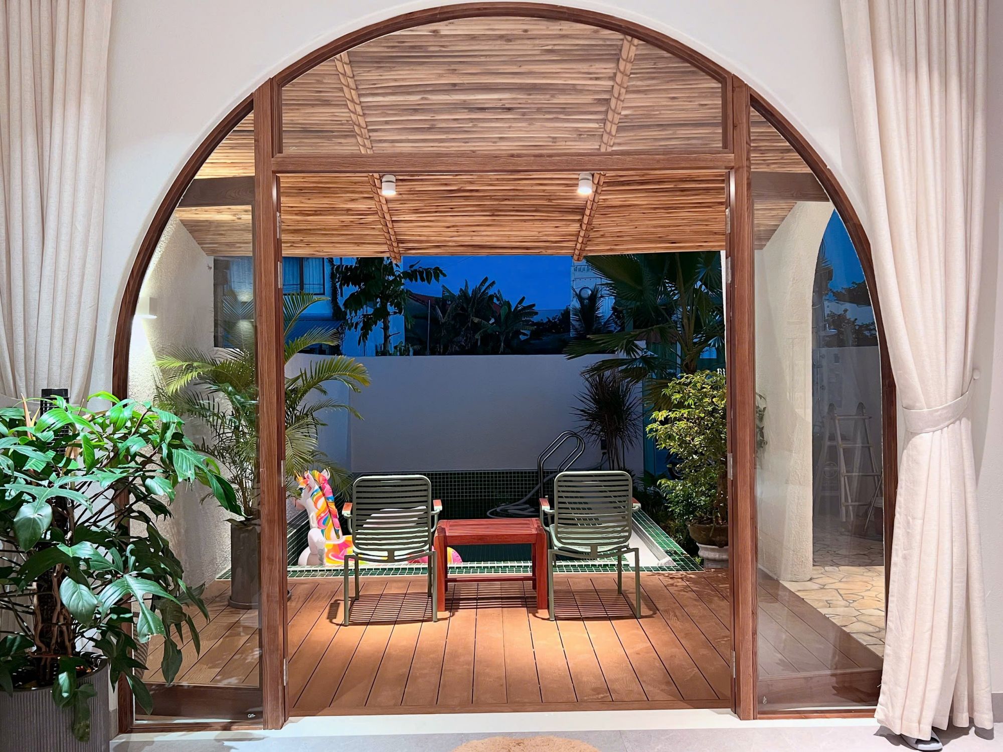 Điểm nhấn nổi bật của villa chính là hồ bơi riêng ngay trong khuôn viên, mang lại cảm giác nghỉ dưỡng trọn vẹn. Khu vực hồ bơi kết hợp cùng sân vườn thoáng đãng, tạo không gian lý tưởng để thư giãn, tận hưởng không khí trong lành hoặc lưu giữ những khoảnh khắc vui vẻ cùng gia đình và bạn bè.