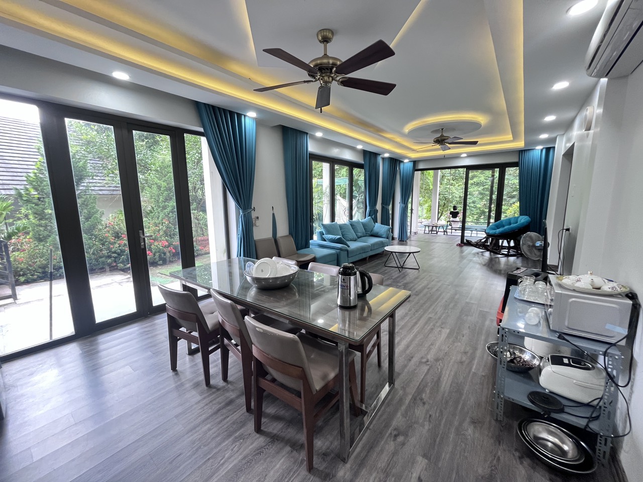 Villa được thiết kế hiện đại, mang lại sự thoải mái tối đa cho du khách. Các phòng ngủ đều có nhà vệ sinh khép kín, được chuẩn bị đầy đủ khăn tắm và đồ dùng cá nhân. Phòng khách nổi bật với sofa sang trọng, Smart TV và hệ thống điều hòa mát lạnh. Bên cạnh đó, khu vực bếp được trang bị toàn bộ dụng cụ từ tủ lạnh, lò nướng, lò vi sóng cho đến nồi cơm điện, bếp lẩu, bát đũa và gia vị, sẵn sàng để du khách tự tay chuẩn bị những bữa ăn ấm cúng.